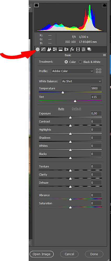 Zodra je een RAW opname opent in Photoshop zal Camera RAW automatisch opgestart worden.