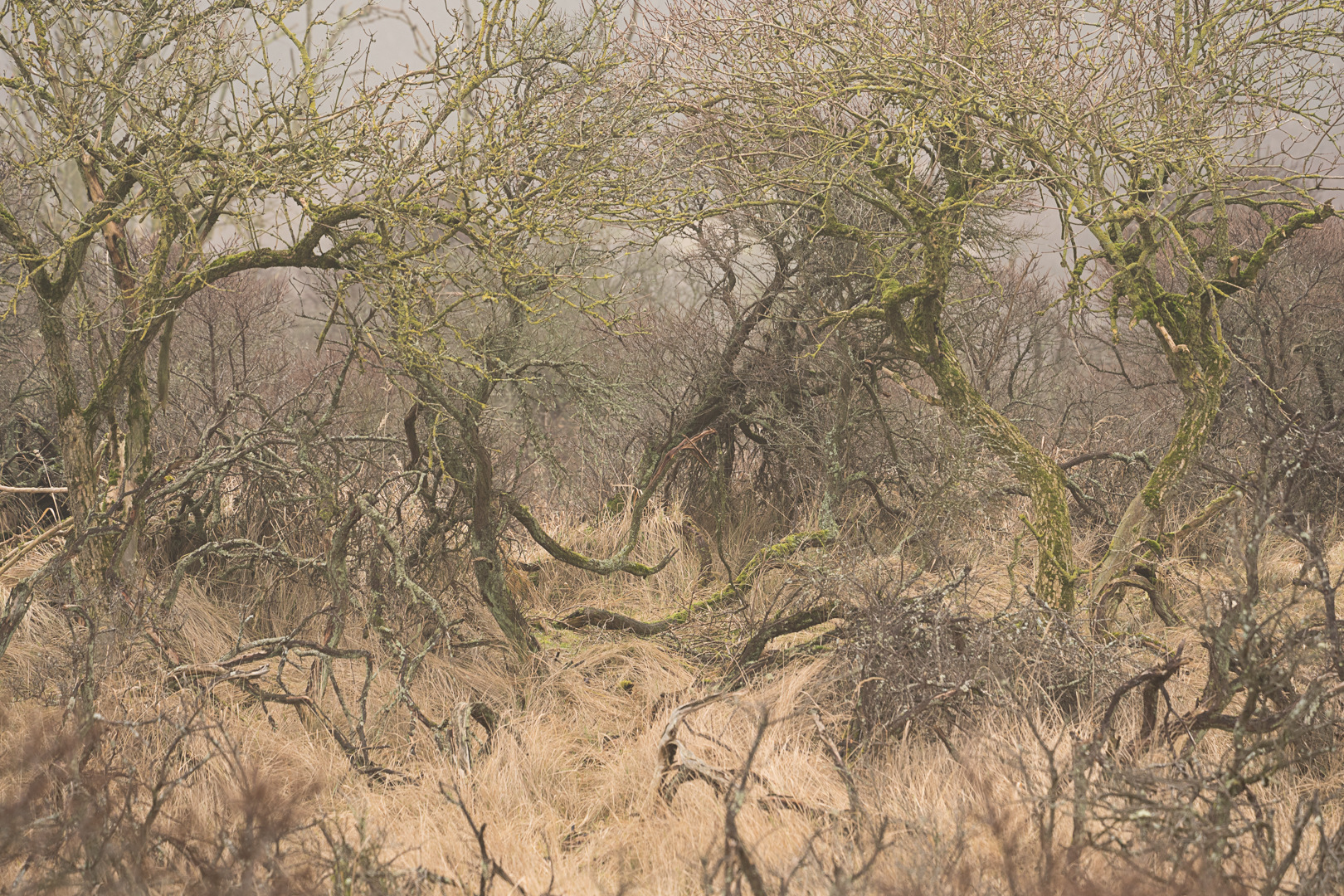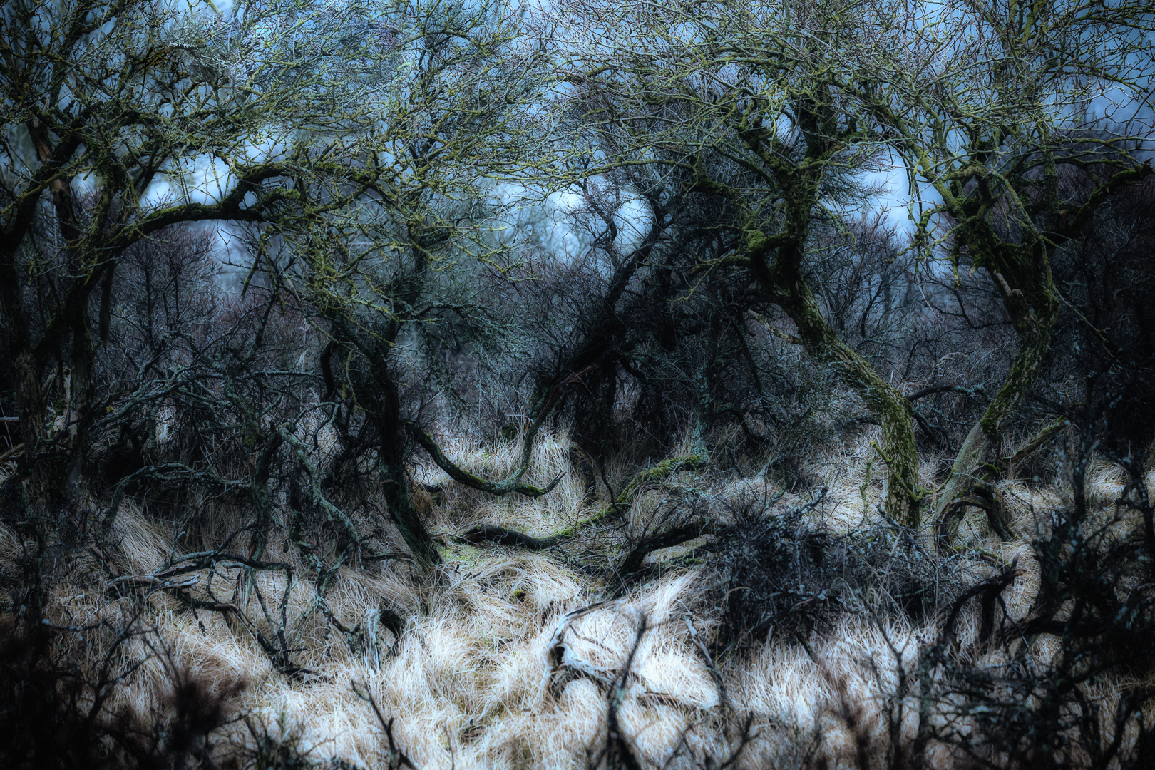 “Op een uiterst sombere januaridag liep ik in de duinen en viel mijn oog op deze chaos, oude maar mooi bemoste meidoorns, krom gegroeid door de wind, duindoorns die aan het eind van hun leven zijn en platgeslagen verdorde grassen. Het geheel trok mij aan en ik probeerde in mijn beeld rust in de chaos te vinden.