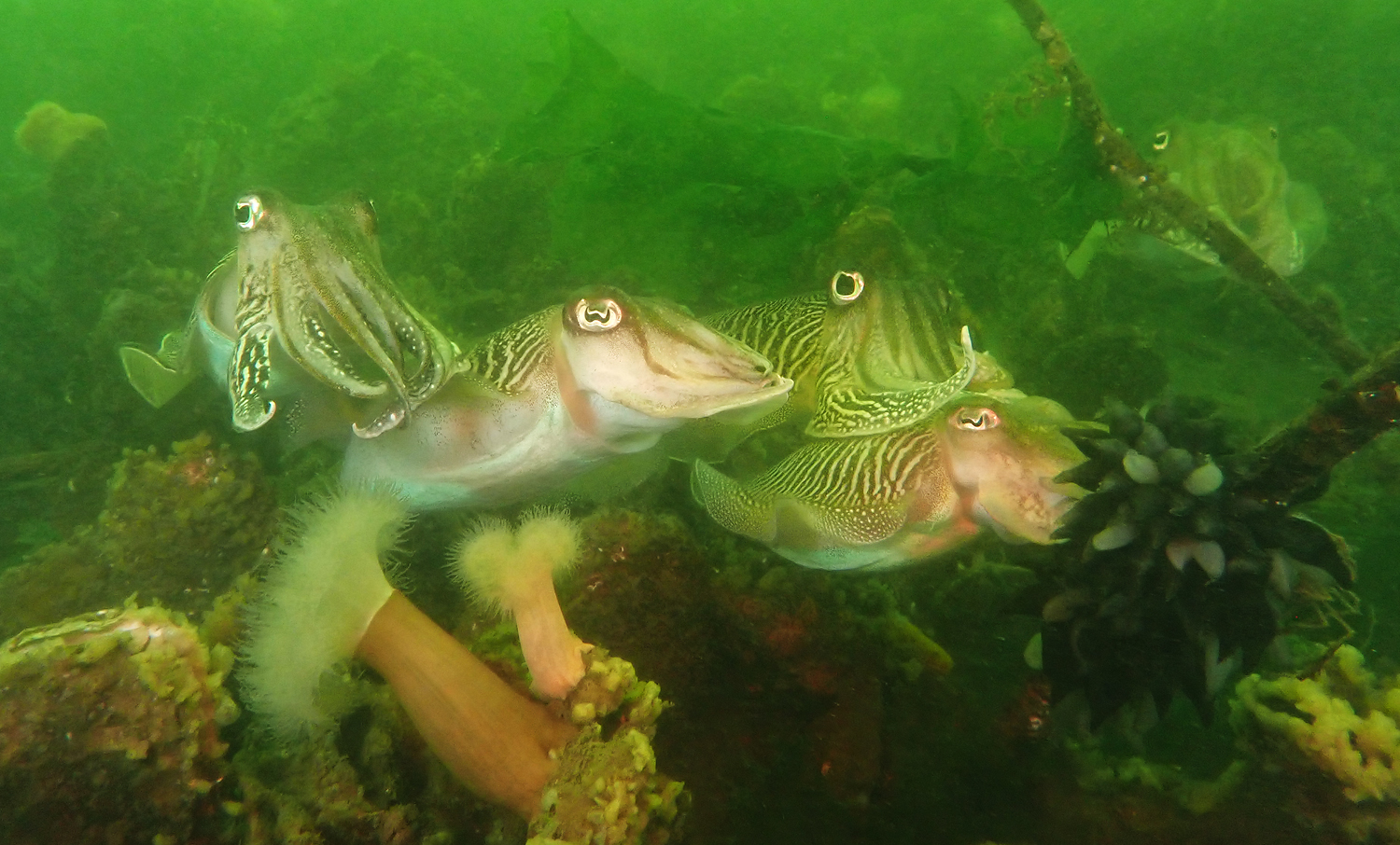 De sepia’s zijn gearriveerd in de Oosterschelde. Soms laten ze zich in grotere aantallen tegelijk zien. Op de foto zie je er 5 terwijl er nog 5 andere sepia’s net buiten de foto rondzwommen.