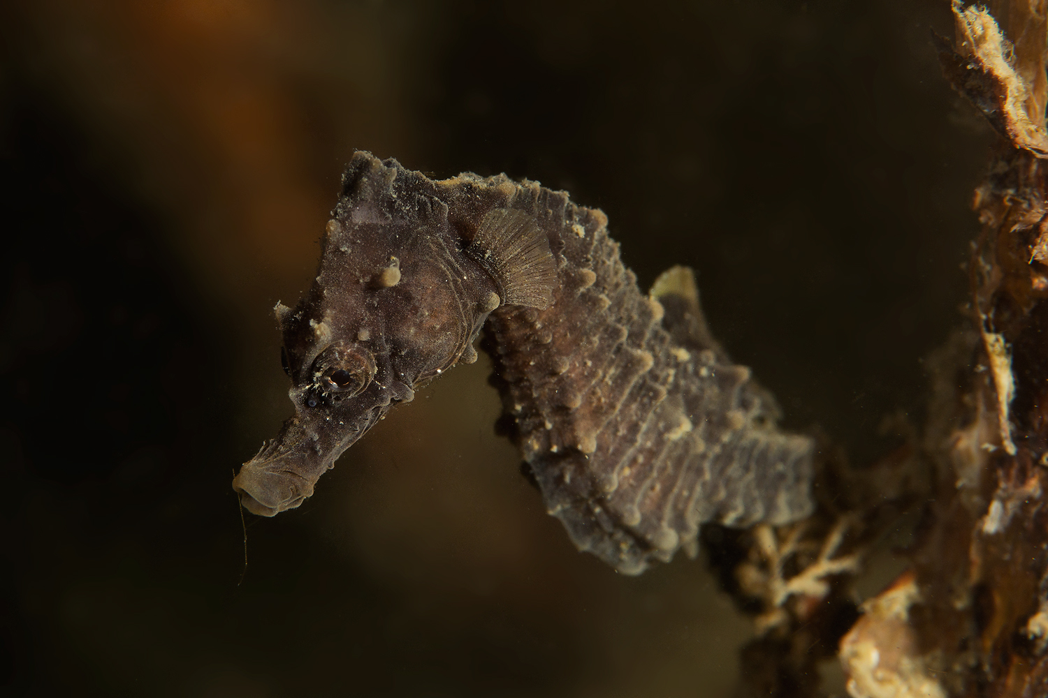 Een zeepaardje bij een wilgentent in de Oosterschelde. De bruine streep achter de kop betreft een wilgentak dat iets verderop staat.