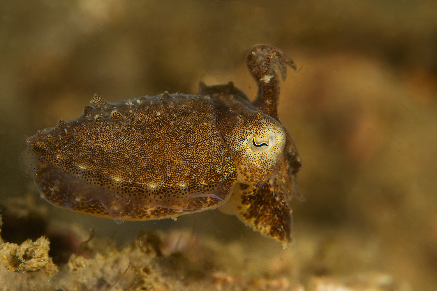 Een jonge sepia van circa 3 centimeter groot zweeft net boven de Oosterschelde bodem.