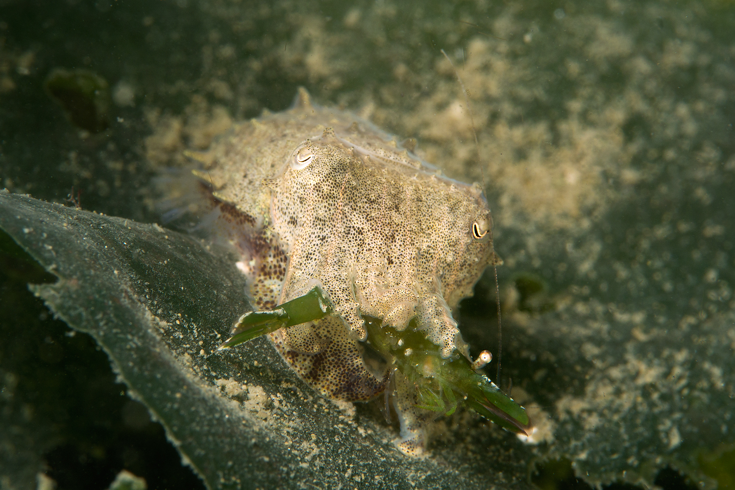 Jonge sepia’s zijn meteen echte rovers. Hier zie je een jonge sepia op een wierblad met een groene Veranderlijke Steurgarnaal in zijn bek. Veranderlijke Steurgarnalen, de naam zegt het al, nemen de kleur aan van hun leefomgeving. In dit geval het groen van het wierblad.