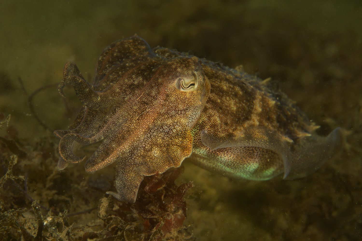 Een al wat grotere jonge sepia van een kleine 15 centimeter. Nog even en de sepia zal de Oosterschelde verlaten.
