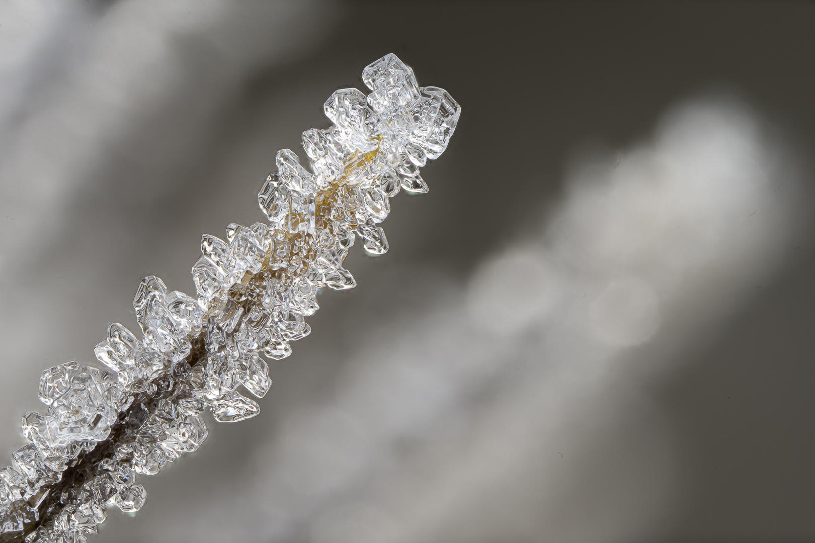 Rijp en bevroren dauwdruppel op grasspriet. Stack van 19 opnames van 0,6s ISO 64, Nikon D850
