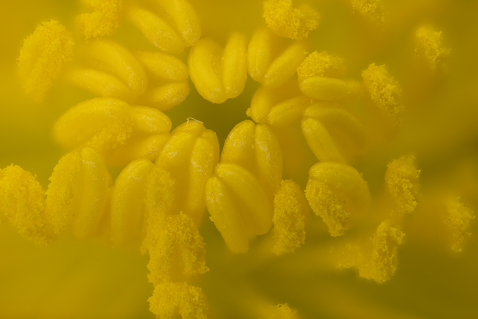 Het hart van een Scherpe Boterbloem (Ranunculus acris). Stack van 120 opnames van 0,8s ISO 64, Nikon D850