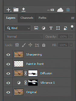 In het uiteindelijke resultaat heb ik nog enkele andere aanpassingen gedaan zoals een gedeeltelijke diffusie van de achtergrond en een kleine schildering in de voorgrond. Dit kan je zien in onderstaande printscreen. De namen van de lagen kan je zelf aanpassen door er dubbel op te klikken en te typen. Handig voor als je later nog eens wilt weten wat je gedaan hebt.