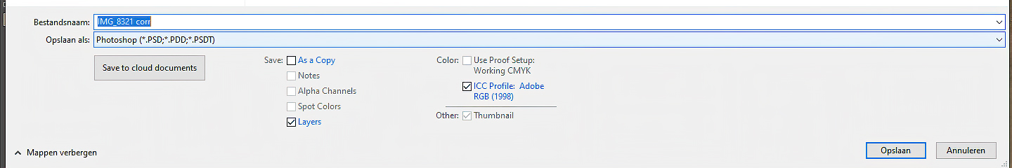 Zoals je ziet heb ik mijn kleurruimte op RGB staan maar dat is mijn persoonlijke keuze. Vergeet niet te controleren of Layers aangevinkt is. Sla op op de plek jouw plek van keuze. Hierna kan je de foto nogmaals opslaan als Jpeg in het formaat en compressie die jij wenselijk acht voor gebruik. Dus bijvoorbeeld 1080PX hoog voor Deel de Natuur. Dit is dan jouw versie voor Web publicatie.