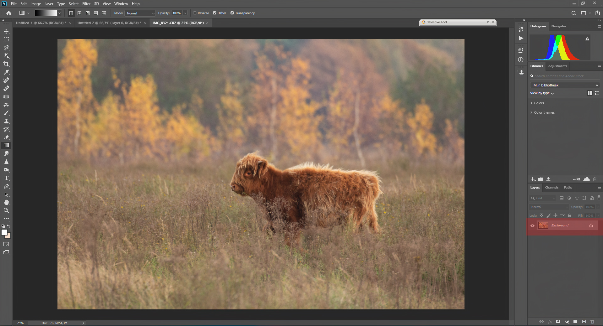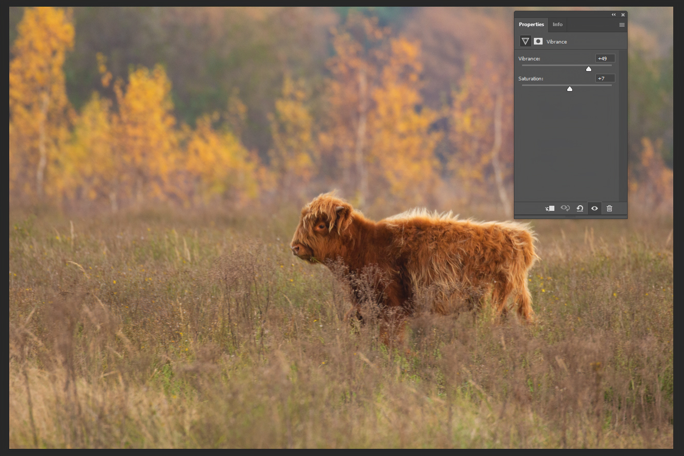 Allereerst voeren we wat basis handelingen uit om de foto wat te pimpen (als je dit in reeds in Camera Raw hebt gedaan is dat misschien niet eens meer noodzakelijk). Daarna zou ik graag de kleuren van het dier en de geel/oranje berken boompjes in de achtergrond wat sprekender willen maken zonder daarbij de andere delen van het beeld te beïnvloeden. Een plaatselijke aanpassing dus.