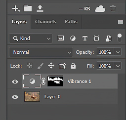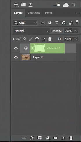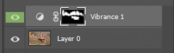 In dit geval kiezen we voor de optie Vibrance / Levendigheid. Het voordeel van deze optie ten opzichte van saturation / verzadiging is dat (vooral bij huidkleuren) het rood minder onnatuurlijk versterkt wordt. Het voordeel van deze aanpassingslaag is dus dat de instellingen te allen tijde aangepast kunnen worden. We zetten de schuifjes zo dat de aanpassing voor die delen die we wilden beïnvloeden OK is.