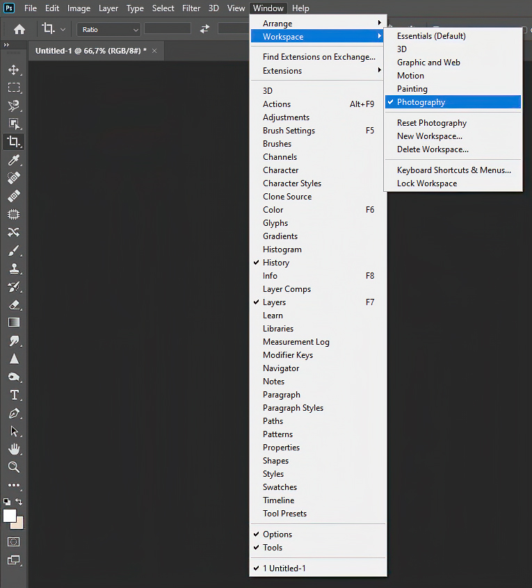 Waar vind je Lagen in Photoshop Je kan de werkruimte van Photoshop zo instellen dat deze voor jou het beste van toepassing is. Ben je fotograaf dan zal de optie Fotografie meestal de juiste keuze zijn. Daarnaast kan je te allen tijde deze werkruimte uitbreiden, aanpassen en zelfs opslaan onder een persoonlijke instelling. De opties vind je in de bovenste menubalk. Kies: window /workspace / photography