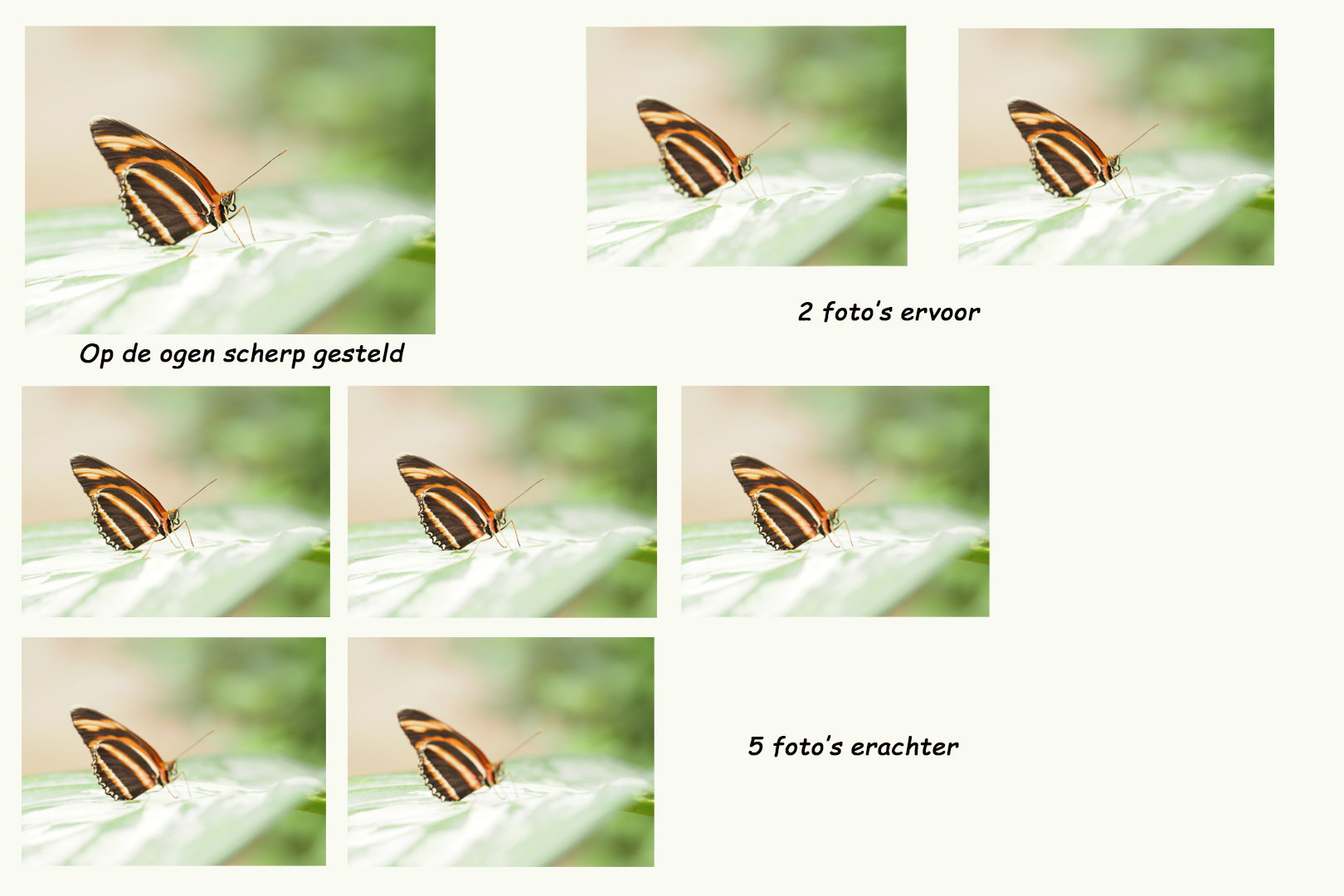 Later ga je al die gemaakte opnames in een computerprogramma samenvoegen (stacken = stapelen) tot één foto waarin alles scherp is. Houd er wel rekening mee dat dit hele grote bestanden kunnen worden en dit ook het nodige van de specs van je PC vraagt.