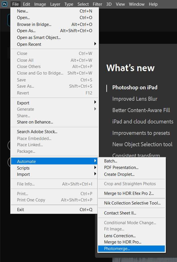 Open Photoshop (zoals je ziet bezit ik een Engelstalige versie) Uiteraard kan het ook met vroegere versie van Photoshop. Kies in de menubalk File > Automate > Photomerge