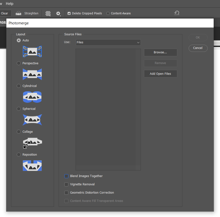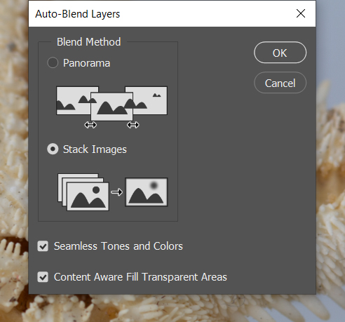 Zorg dat Auto aangevinkt is en Blend Images together uitstaat. Druk op Browse en kies je foto’s die je wilt samenvoegen. Deze krijg je nu in het middenpaneel te zien en druk op OK.