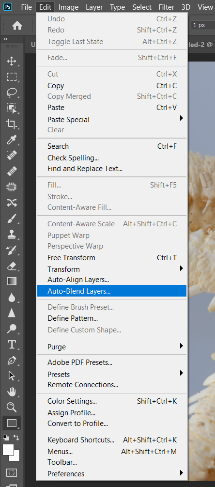 Selecteer alle lagen door gebruik te maken van Shift en klik (standaard toetsenbord handeling). Ga in de menubalk naar Edit > Auto-blend layers