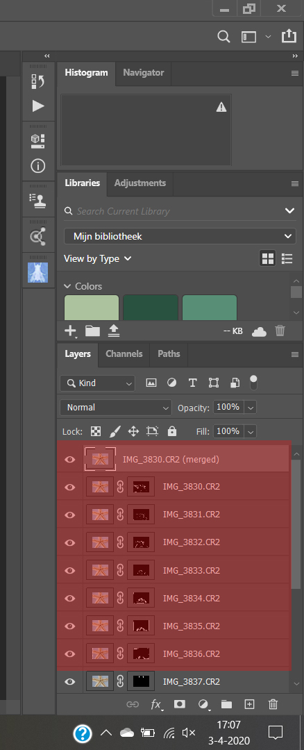 Het volgende beeld is nu bij je lagen in het rechterpaneel te zien. In het rood gearceerde deel zie je de lagen met verschillende maskers en bovenin het nieuwe uiteindelijke scherpe eindresultaat (merged = samengevoegd):