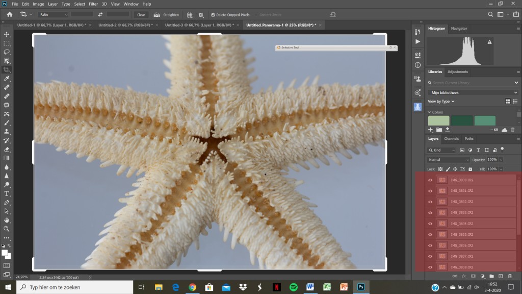 Het uiteindelijke resultaat direct als Jpg uit de Olympuscamera Er zijn meerdere software programma’s die je kunt gebruiken voor Focus Stacking zoals Helicon Focus, Zerene stacker, CombineZP en Picolay. Zelf maak ik gebruik van Adobe Photoshop en zal hieronder in een aantal stappen uitleggen hoe ik te werk ga. De foto van de zeester is gemaakt met een 100 mm macro objectief met F 5.6 (14 opnames)