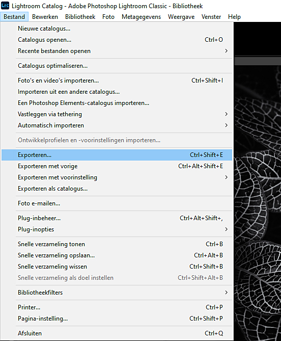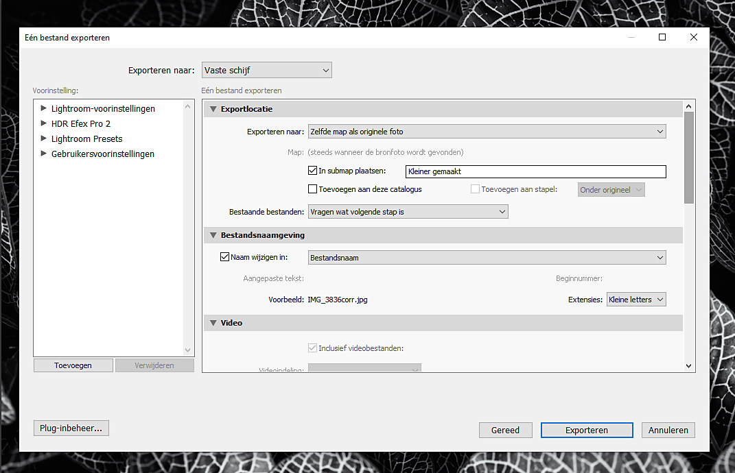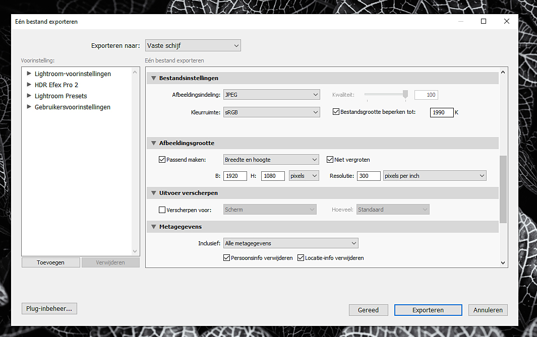 Hierna kan je de foto exporteren zoals je dat normaal gewend bent met LR.