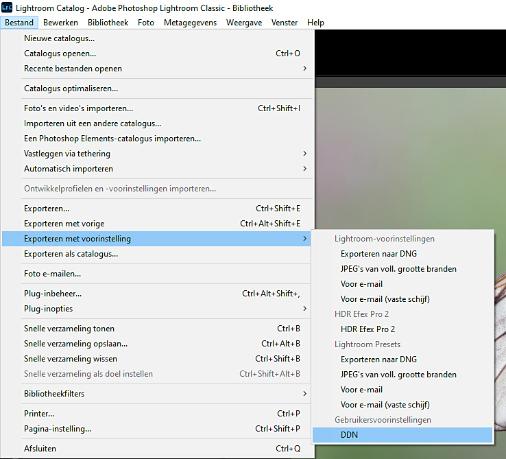 Kies Bestand > Exporteren met voorinstelling > DDN