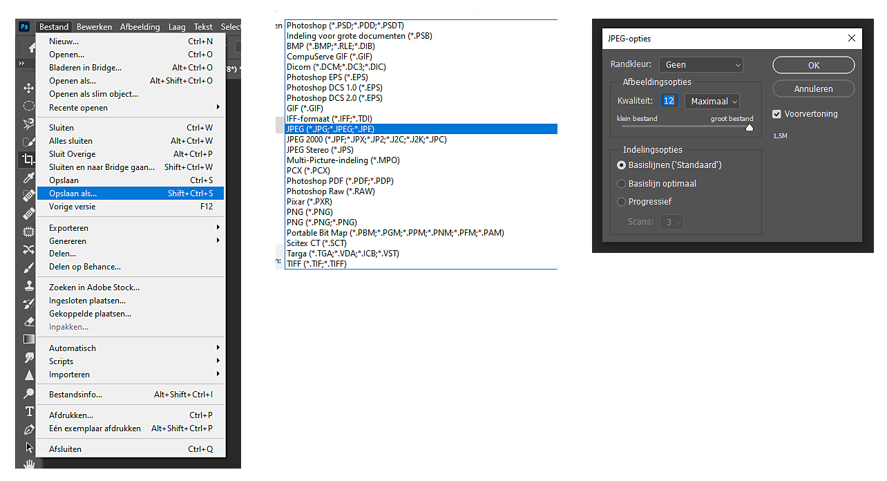 - Sla de foto op in vol ornaat op zoals je normaal zou doen, zodat je ook een Jpeg (of ander formaat) hebt met optimale kwaliteit.