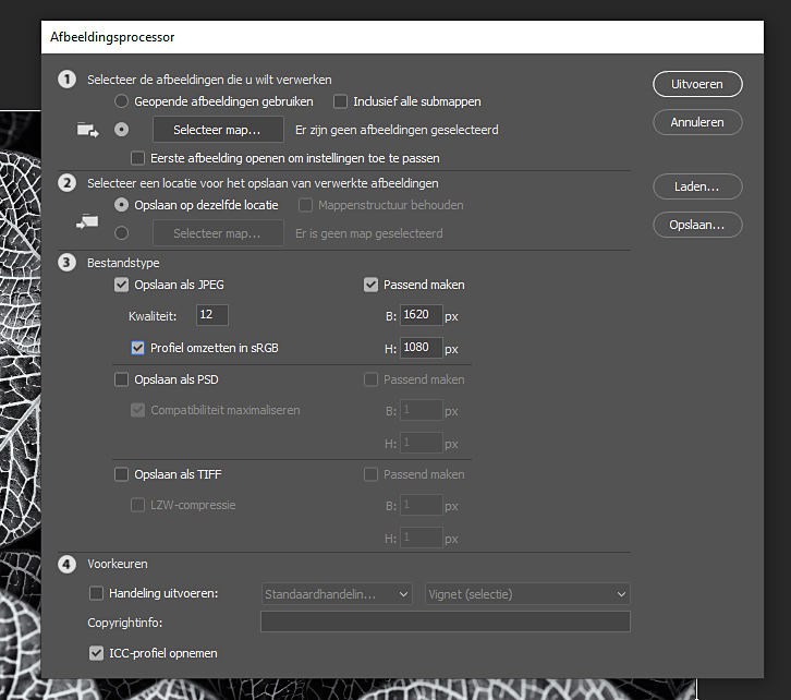 In Photoshop is het mogelijk om een script uit te voeren wat alle handelingen van verkleinen van je foto automatisch uitvoert. Als je veel foto’s tegelijk wilt aanpassen is dat een heel handige optie die erg snel is.