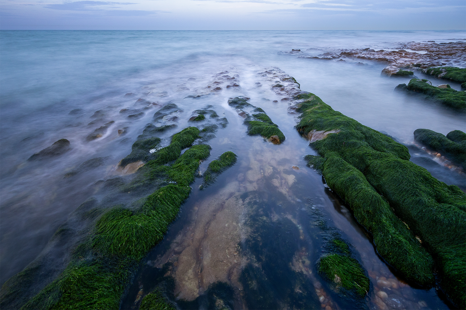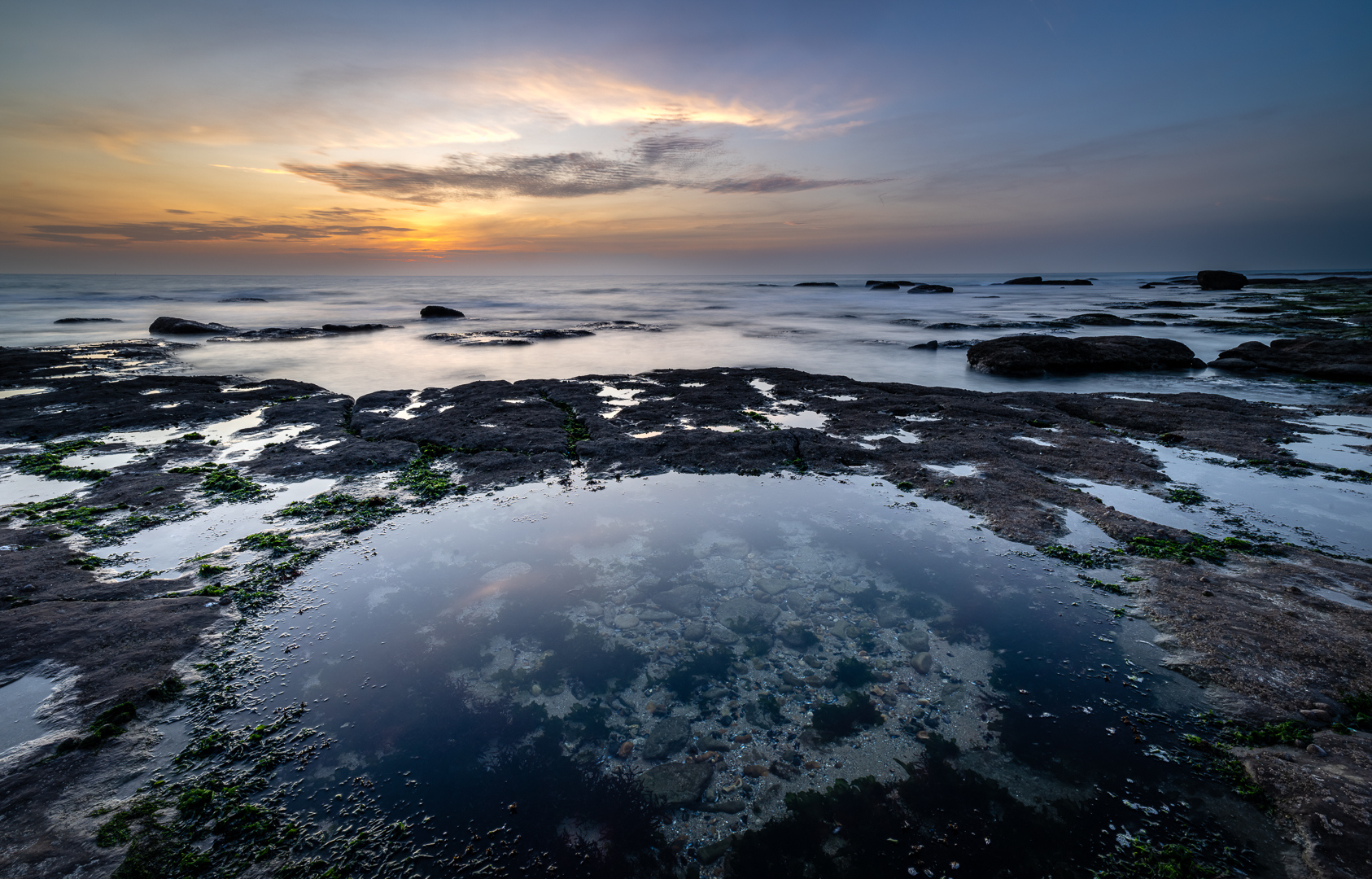 De volgende ochtend stonden we alweer vroeg aan het strand. Jammer genoeg was er geen mooi licht of rood van een zonsopkomst. Boven de zee hing een beetje sluierbewolking. De voorgrond van de rotsen met de opkomende vloed was echter des te interessanter. Nu ik de foto terug zie lijkt hij bijna wel met een drone gemaakt, maar het is met 16 mm van een wat hoger standpunt en dan bovenop je onderwerp kruipen. Door gebruik te maken van een ND filter van 6 stops heb ik een wat langere sluitertijd verkregen die de “rust” in het stromende water geeft, maar ook net nog wat dynamiek meegeeft. Bijzonder toch, om te zien dat Loes een heel andere foto heeft terwijl ze slechts 5 meter verderop stond. Dat is nu juist zo leuk van samen op stap gaan.