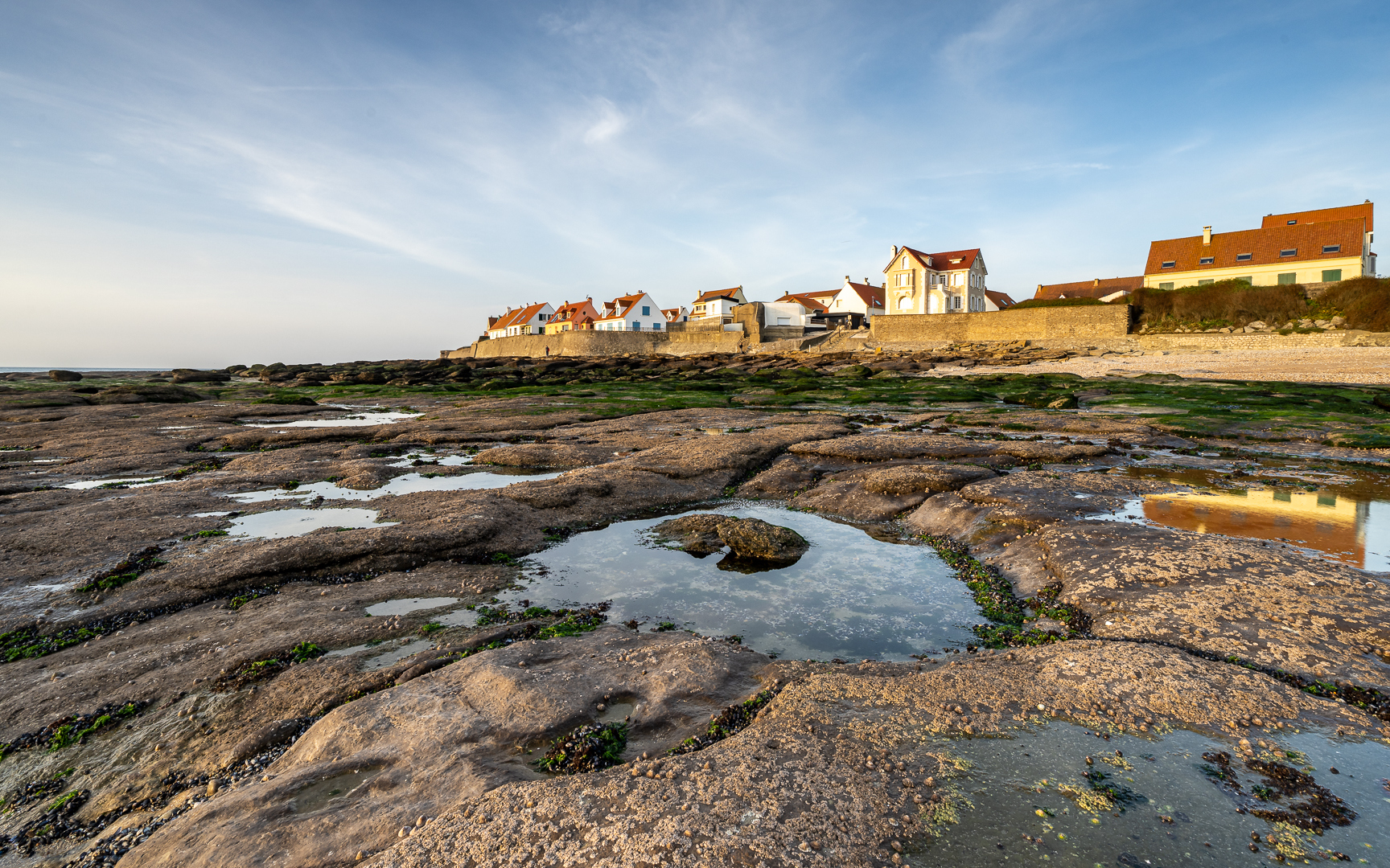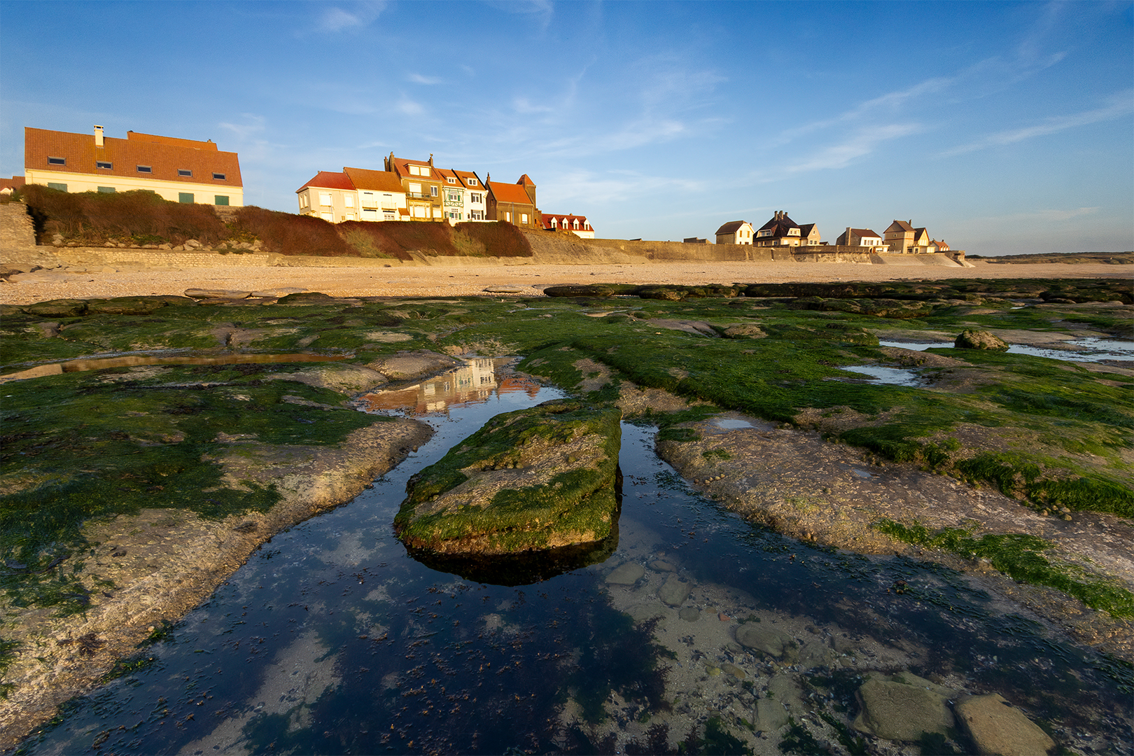 De middag van onze aankomst aan de Opaalkust was de kust zonovergoten, met een strak blauwe lucht. Niet direct de ideale omstandigheden voor landschapsfotografie. Maar er is een gezegde dat “Elk weer fotografie weer is” en het was heerlijk om in het zonnetje uit te waaien. Een uitdaging dus, met als eindresultaat een ansichtkaart. Het was eb, dus de rotsen waren mooi vrij gekomen en overal stonden waterpoeltjes. De groothoek dus uit de tas om dat alles ruim in beeld te krijgen waarin ik de reflectie van de huizen in het water bewust een duidelijke plek heb gegeven in de compositie.