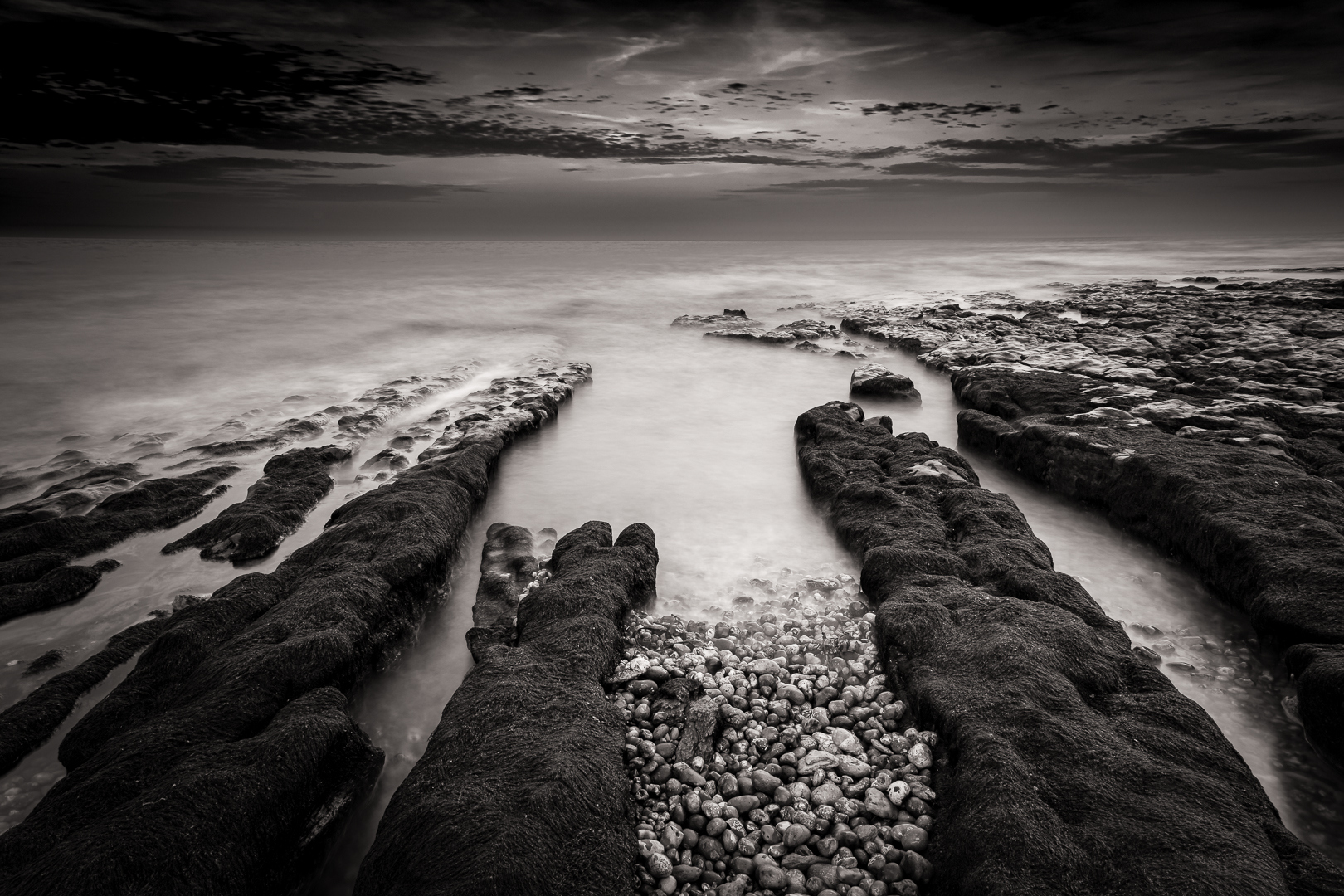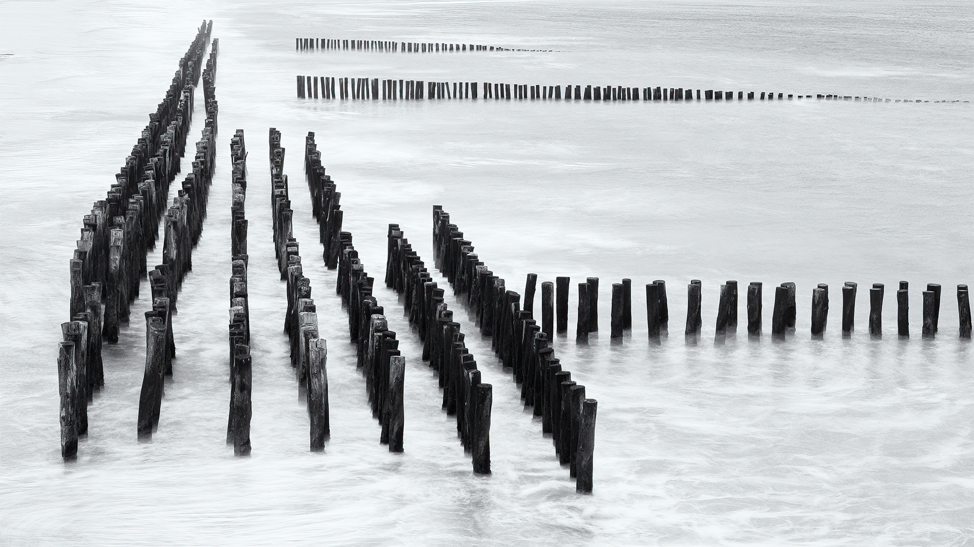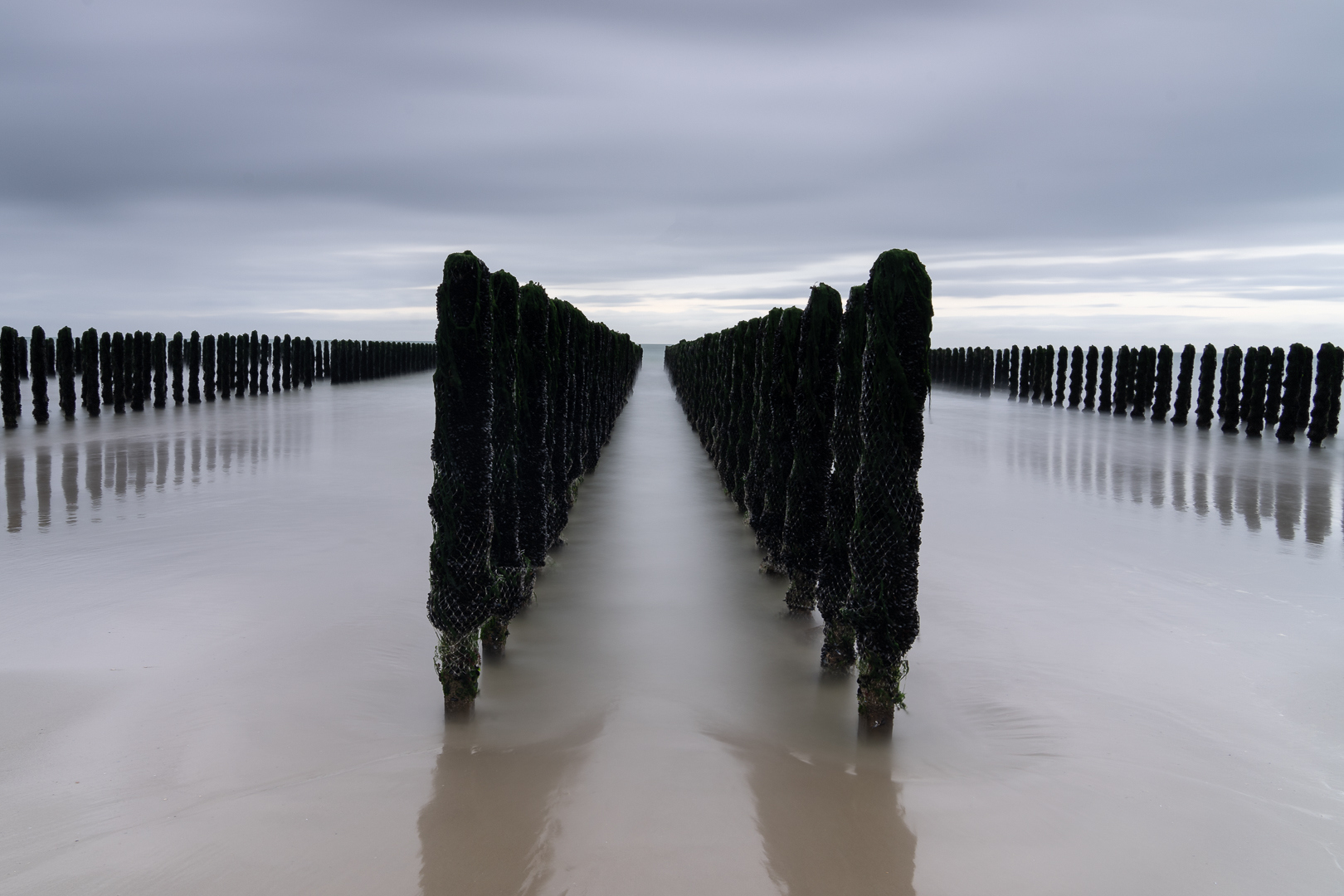 Ik heb geprobeerd de mosselbanken wat strak en minimalistisch in beeld te brengen, gekozen voor een symmetrisch beeld en een sluitertijd van 25 seconden zorgde voor rustig en glad water.