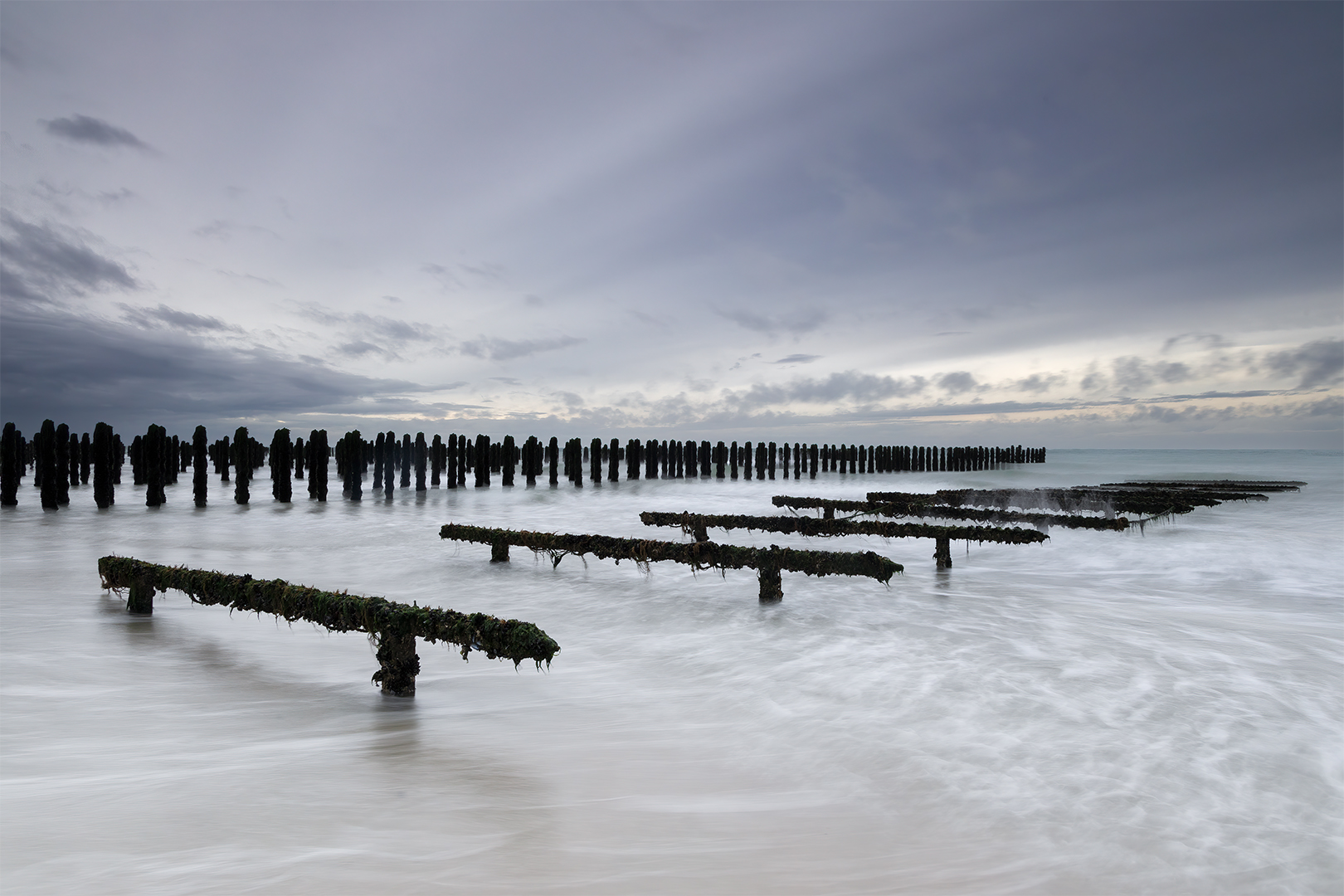 Getijde tabellen zijn het toverwoord om te kunnen fotograferen aan de Opaalkust. De mosselbanken staan een groot deel van de dag onderwater, dus je hebt slechts een kort moment om ze “vrij” te kunnen fotografen. Daarnaast moet je ook nog een flink stuk over het strand afleggen om er te komen en mag je niet verrast worden door de opkomende vloed. Iets wat echt heel belangrijk is, want je veiligheid gaat voor alles. Ja…. die palen lenen zich toch het beste voor en lange sluitertijd, dus met laarzen en een regenbroek het water in en proberen niet verrast te worden door de opkomende vloed. En vooral je statief vast blijven houden.