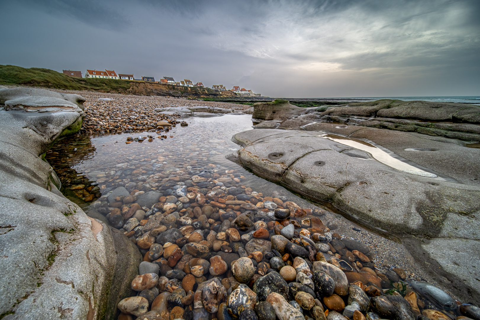 In de middag werd het gelukkig weer droog en ging de wind wat liggen. Het hoge water trok terug en toen was een een perfect moment voor een bezoek aan een keienstrandje net buiten Audresselles. Daar heb ik me urenlang vermaakt met mijn 12mm groothoeklens, lekker dicht op de voorgrond kruipen en veel omgeving in beeld meenemen.