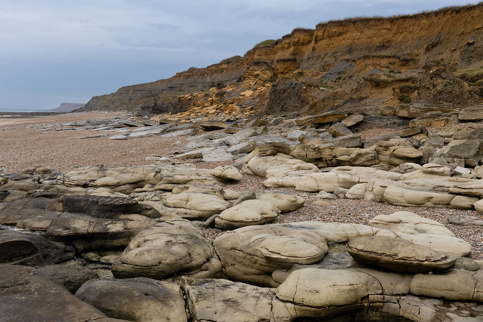 Wat een gave plek is dit, daar kan ik echt vaak naar toe en ook hier ziet het er elke keer anders uit. De enorme rolkeien die als platte schotels afgesleten zijn door het water in vele jaren staken mooi af tegen de terracotta kleur van de afbrokkelende kustlijn.