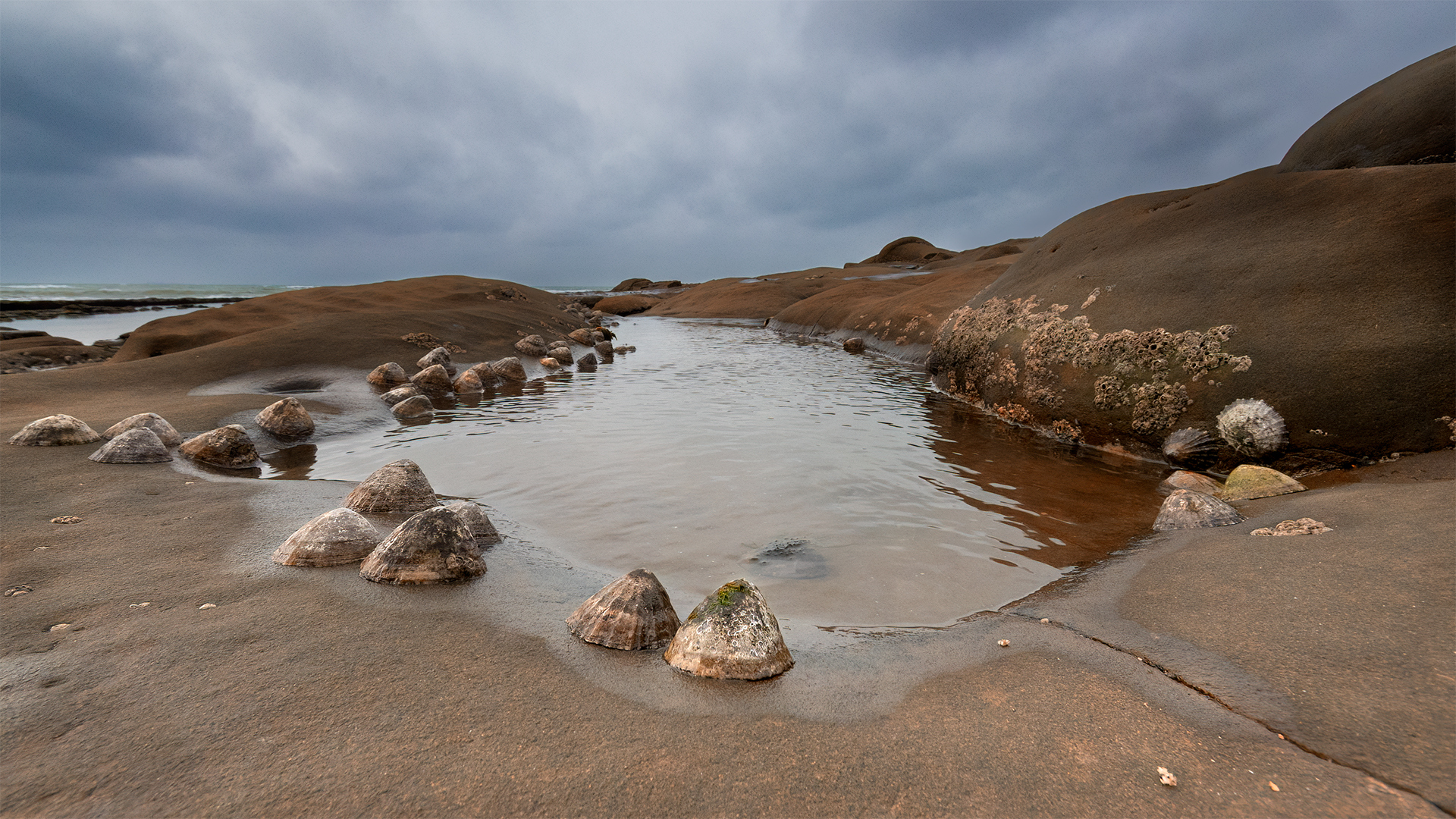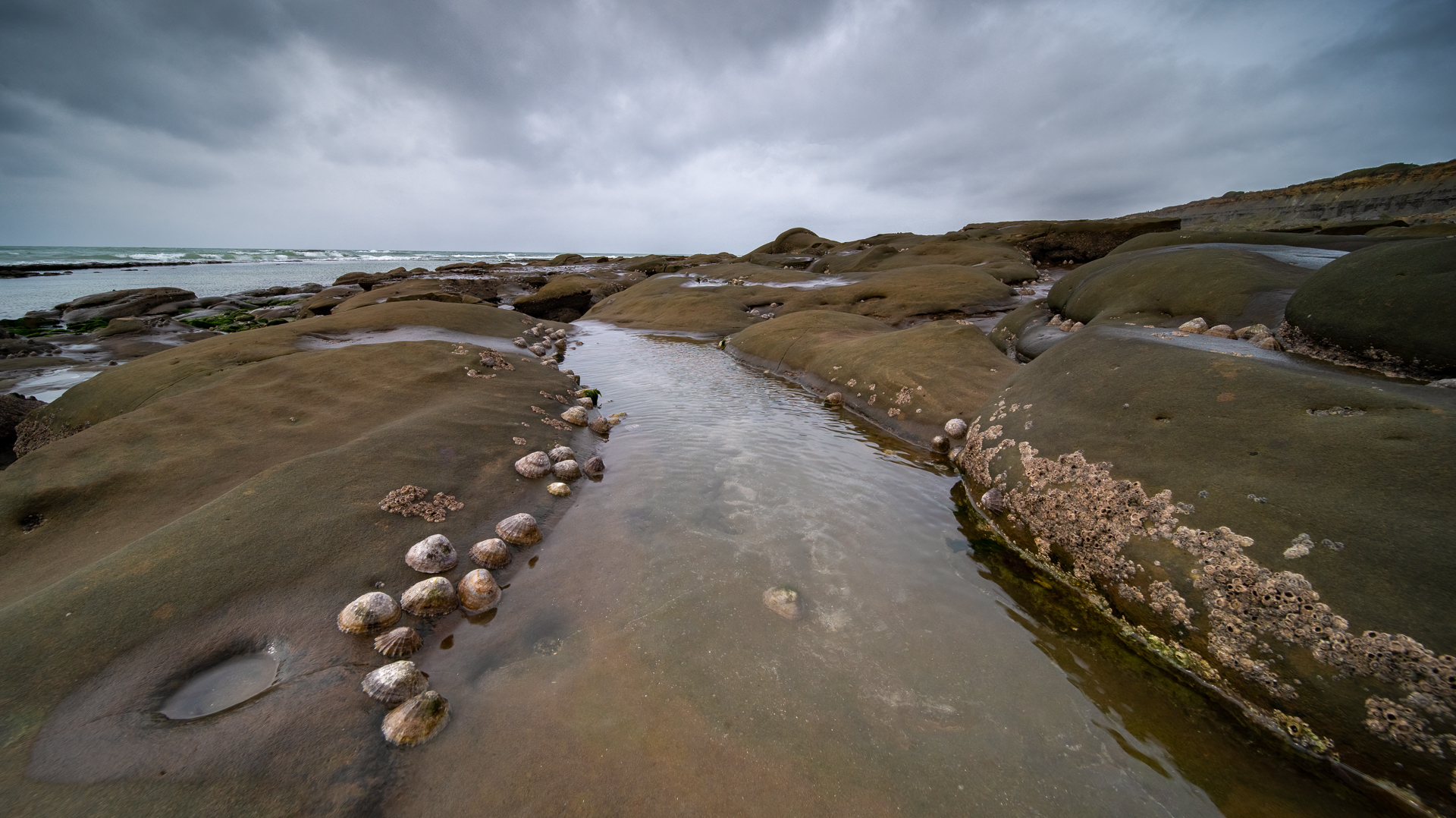 Al die keien met waterpoeltjes leenden zich perfect voor groothoek opnames. Ik lig hier met mijn mijn camera met 16 mm objectief vlak voor een heel klein poeltje waar op de rand schelpen hun huisje hebben. Het lijkt een enorme rivier, dit minilandschap. Maar in werkelijkheid is het slechts 1 meter lang. Gaaf toch om te zien dat met een net iets ander standpunt Loes een compleet ander beeld heeft gekregen. Ook die 4mm verschil in het objectief maakt best veel uit.