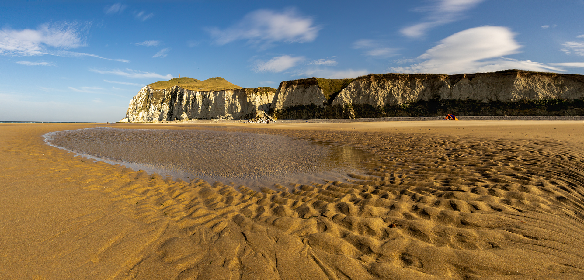 Oef….. Ansichtkaart weer en een uitdaging met al dat zand en witte krijtrotsen. Ik ben hier vorig jaar ook geweest in het zelfde jaargetijde en ik merk dat alles er weer anders uitziet. Strand en zee zijn zo onderhevig aan weersomstandigheden en getijde dat je hier vaak kan terugkomen en het er steeds anders uitziet. Gaaf toch! Plat op de buik met de groothoek in een panorama van 6 staande opnames, die in de nabewerking zijn gestitched met Photoshop CC. Meteen dus een zeiknatte broek en shirt en de hele middag zand in je ondergoed, maar dan heb je ook wat!