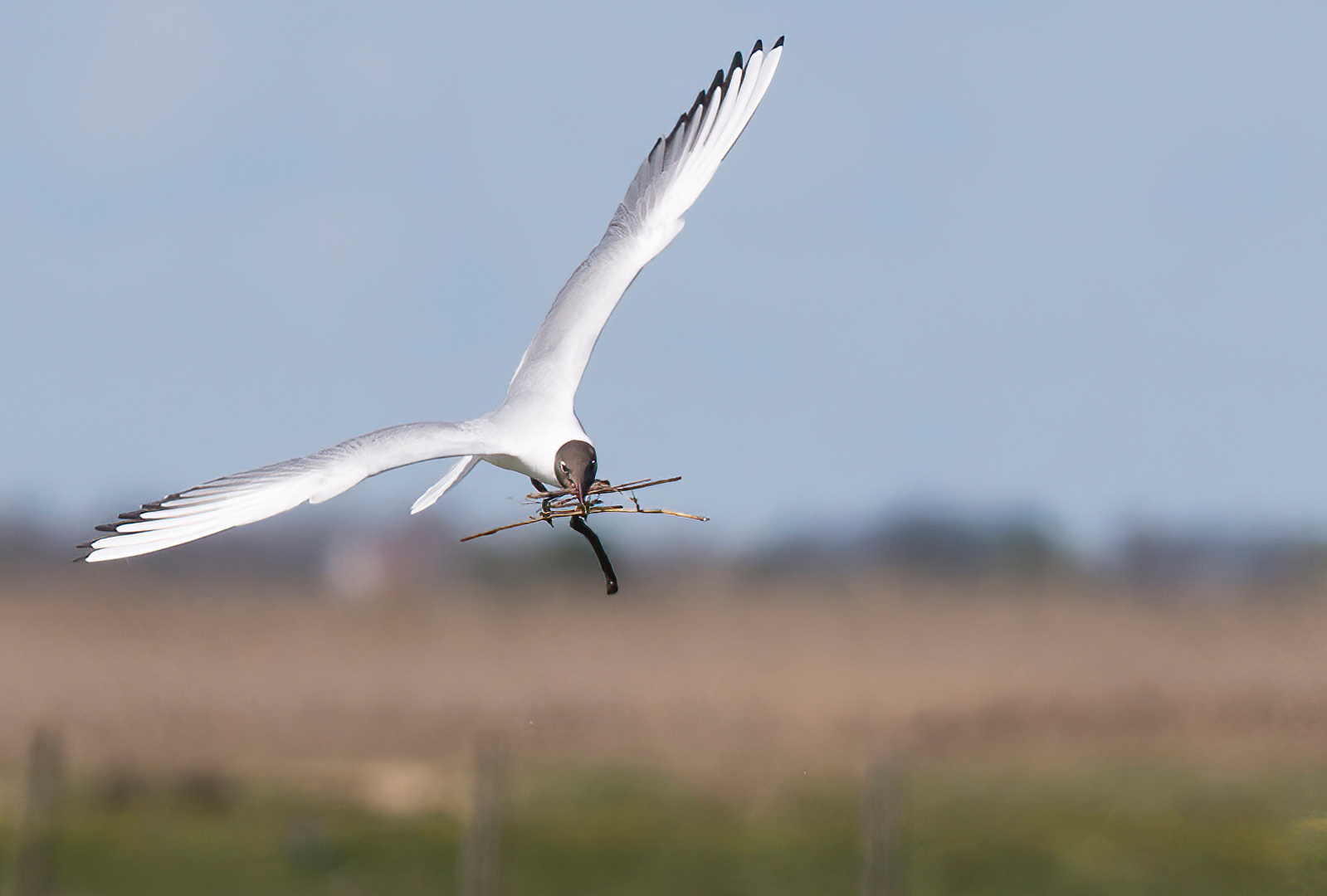 Ik maak normaal gesproken niet zo vaak foto’s van vogels. Maar als ik wat langer op een plek verblijf waar ook veel vogels zijn, dan laat ik die kans natuurlijk niet lopen. We hebben enorm veel vogels gezien op Texel: slapende, vechtende, parende, schuilende en overvliegende. En dan ook nog veel verschillende soorten. Maar vaak zaten ze ver weg of doken ze in elkaar voor de regen en wind (Net als wij). Deze kokmeeuw kon ik op een droog moment mooi in vlucht fotograferen en ik zag pas thuis dat hij de snavel vol had met nestmateriaal. Op de oorspronkelijke complete foto zie ik zelfs dat hij een tak uit de snavel laat vallen. Ik ben blij dat ik de vogel er scherp op staat tegen een relatief rustige achtergrond. Gemaakt met mijn 400 mm lens F5,6 S1/1250 . In de nabewerking heb ik een uitsnede gemaakt en de foto iets verscherpt.