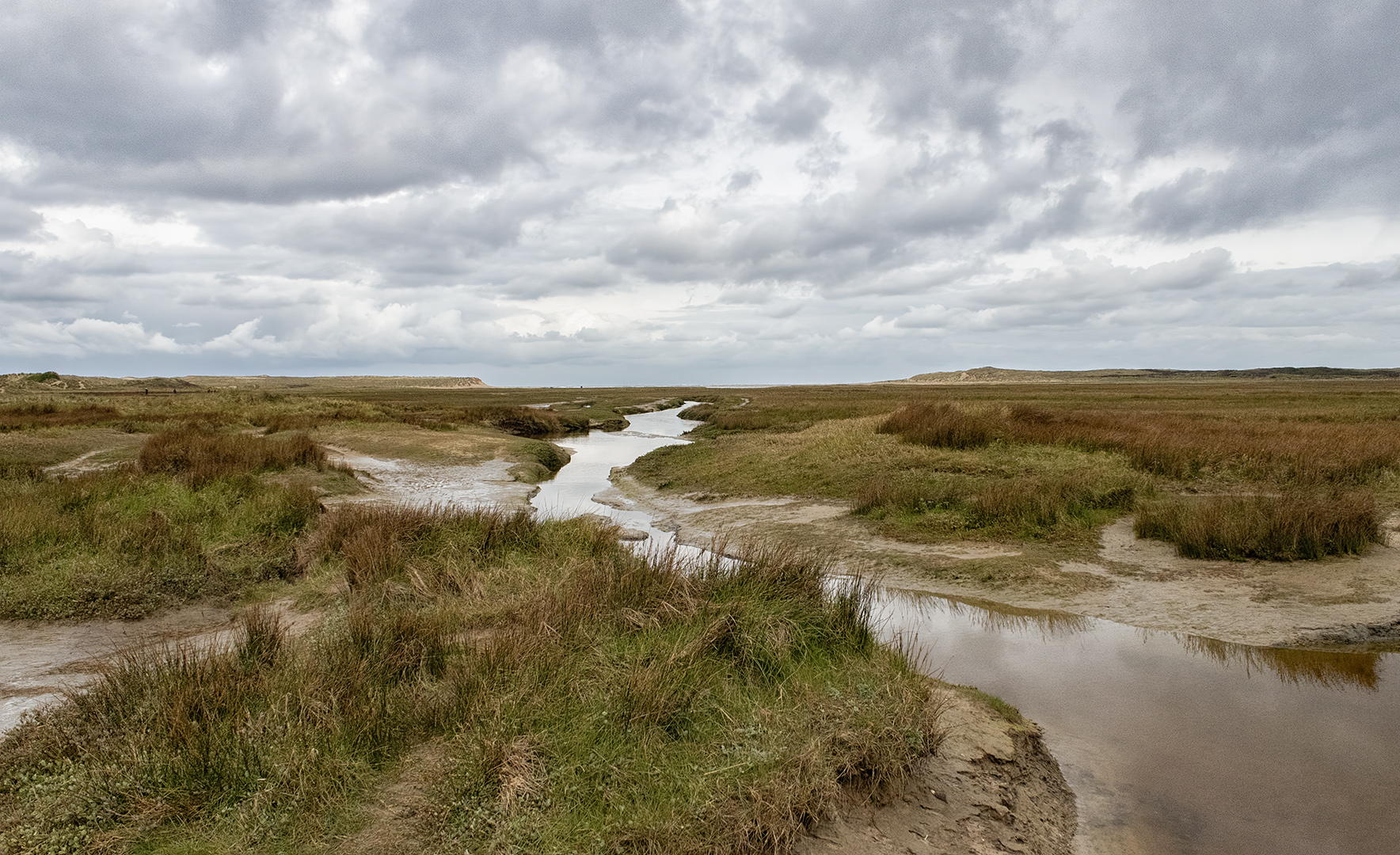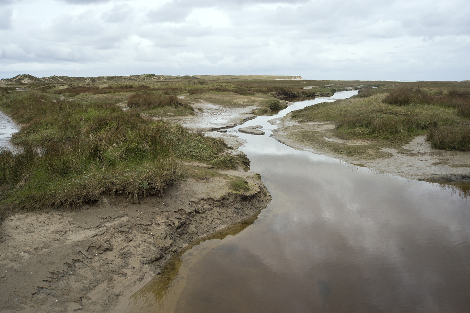 Samen met Brigitte, Karin en Birgitte ben ik vijf dagen in April op Texel geweest. We bezochten o.a. De Slufter. Het Sluftergebied bestaat uit een krekenstelsel dat soms na een storm onder water staat. Één van deze kreken slingerde door het natuurgebied als een grote slang op weg naar de zee. Het was even zoeken naar een mooie compositie waar je dit slingerend effect kon zien.