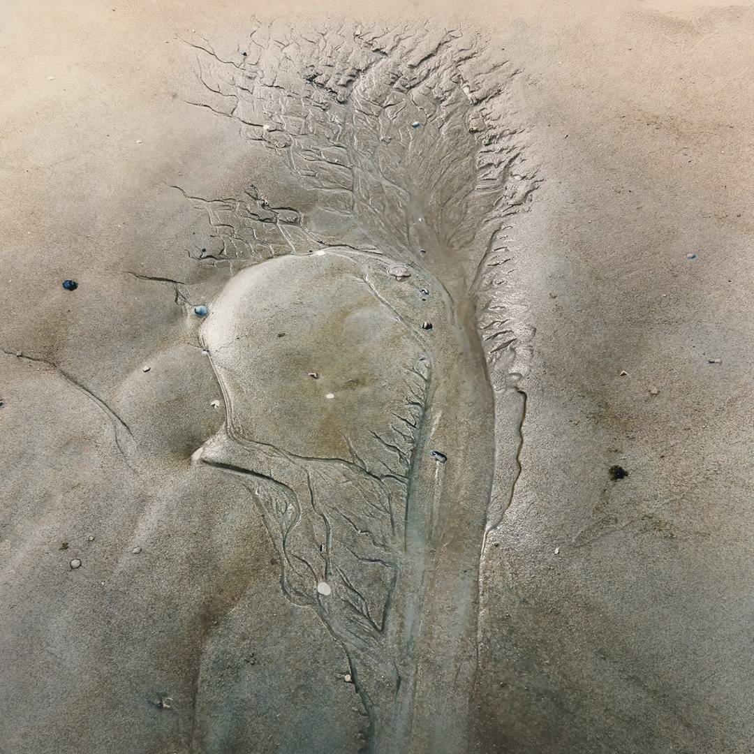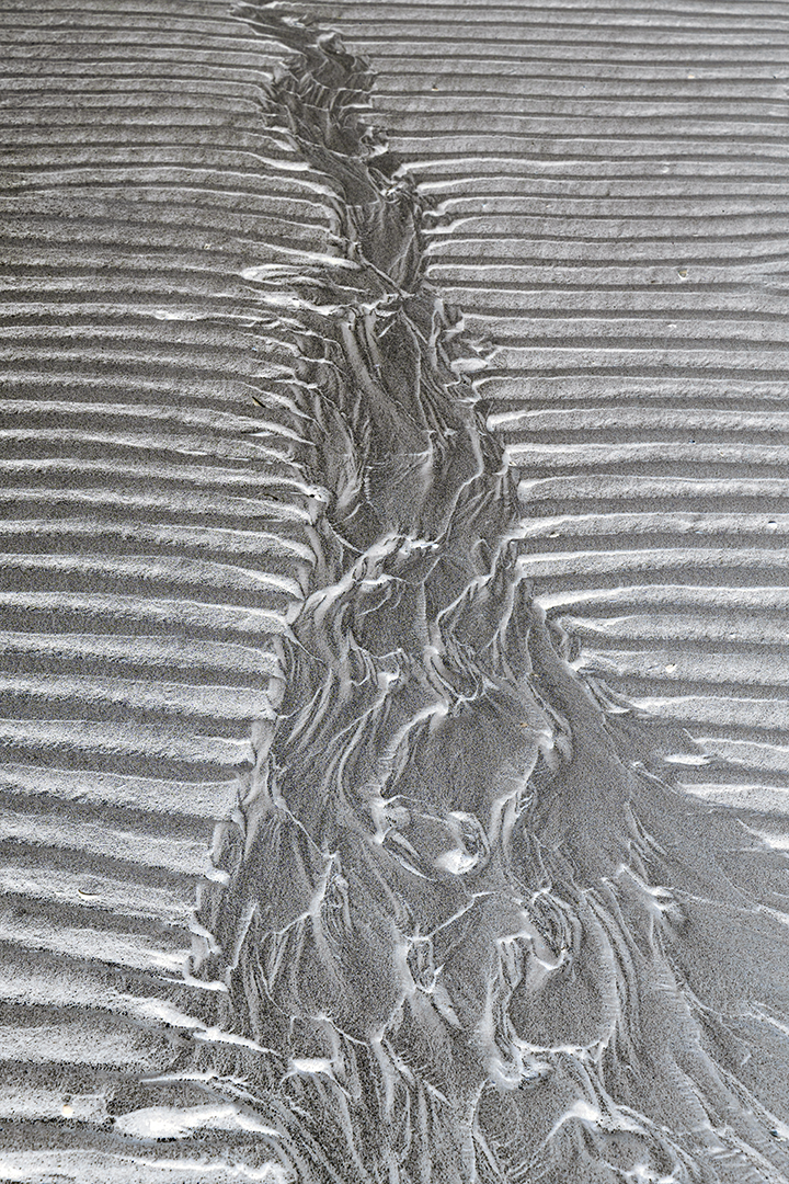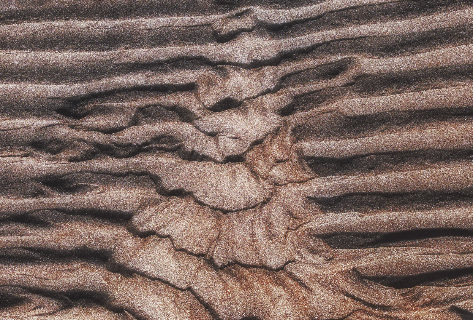 Zandstructuren blijven altijd een dankbaar onderwerp om mee te spelen en te experimenteren. Het licht was echter niet gunstig om mooie contrasten te krijgen; geen diepte, geen kleur. Daarom heb ik in PS wat meer de contrasten en kleuren versterkt waardoor de schoonheid van de zandboom verrassend mooi zichtbaar werd.