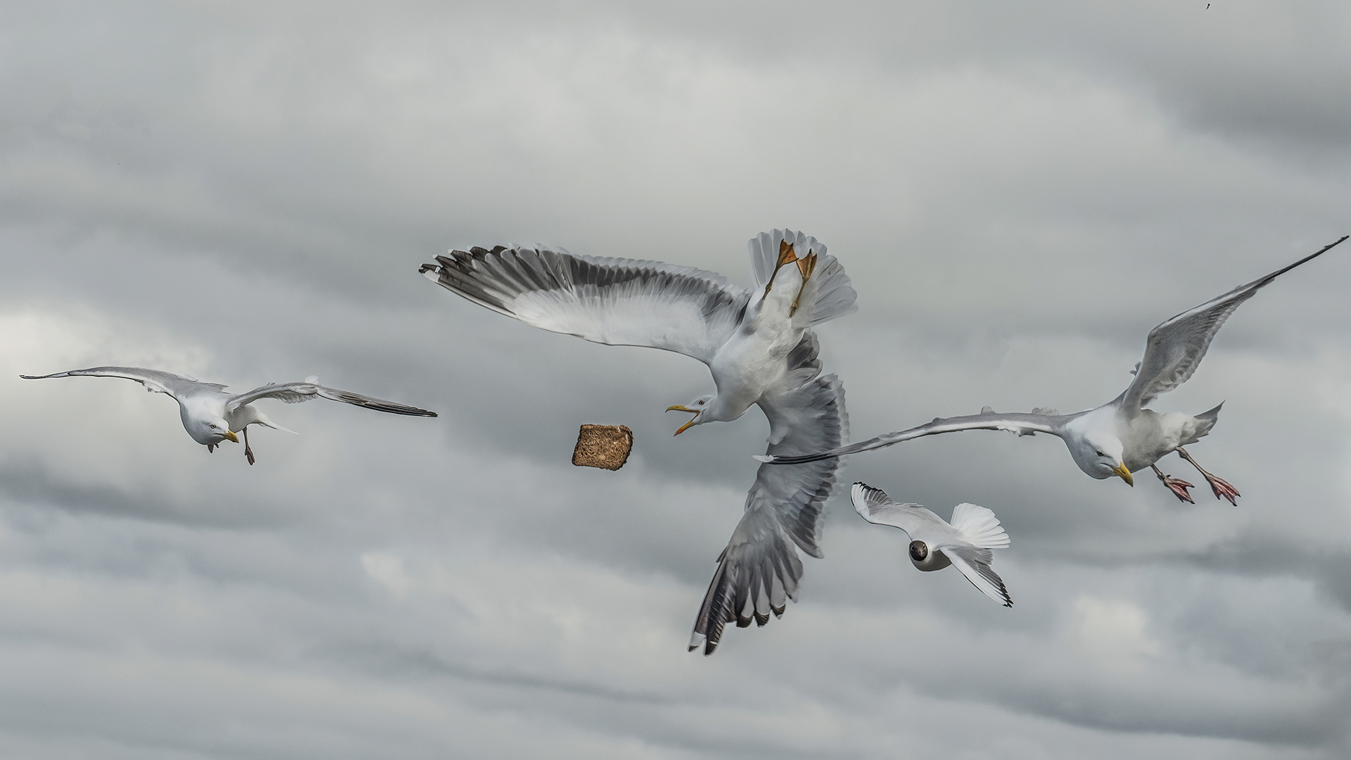 Het was spectaculair om te zien hoe de diverse soorten meeuwen met de boot van Texel naar Den Helder meevlogen in de hoop door de passagiers gevoerd te worden. Nou dit gebeurde volop met hele boterhammen zelfs. Er stonden meer meeuwen op de foto; het was een rommeltje. Daarom heb ik de storende meeuwen weggehaald, zodat er een paar overbleven die in een mooie compositie vlogen. Zelfs de boterham was op de juiste plek. Ik vind het een wat vervreemdende foto, maar daardoor ook wel weer interessant.