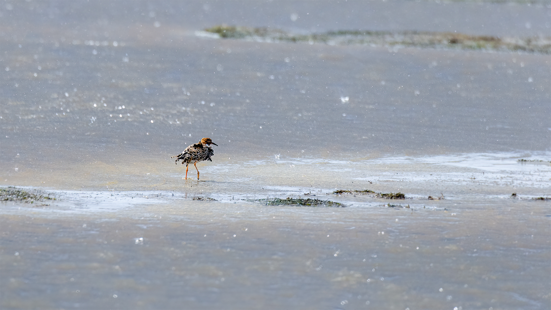 Een kemphaan stond al lang op de wishlist en dan het liefst onder “bijzondere” omstandigheden. Die dag dat we het gebied Waal & Burg bezochten was zo’n moment. Er zat een groepje kemphanen op best wel verre afstand, waarvan er eentje van de groep was afgedwaald en solo aan het foerageren was. Geduldig wachten dan maar tot het koppie eindelijk eens uit het water kwam. Inmiddels was het weer enorm aan het veranderen, het begon hard te waaien en de regen kwam echt met bakken naar beneden. Dat is wat je ook kan zien aan al die opspattende druppels in het beeld. Graag had ik hem natuurlijk nog van iets dichterbij gehad, maar dat ene moment van net een extra straaltje zonlicht op precies de plek van de kemphaan maakt het voor mij een mooi moment. En die natte kleding… die droogt gewoon weer (400 mm / ISO 1600 en F/7.1) 1/6400 sec.