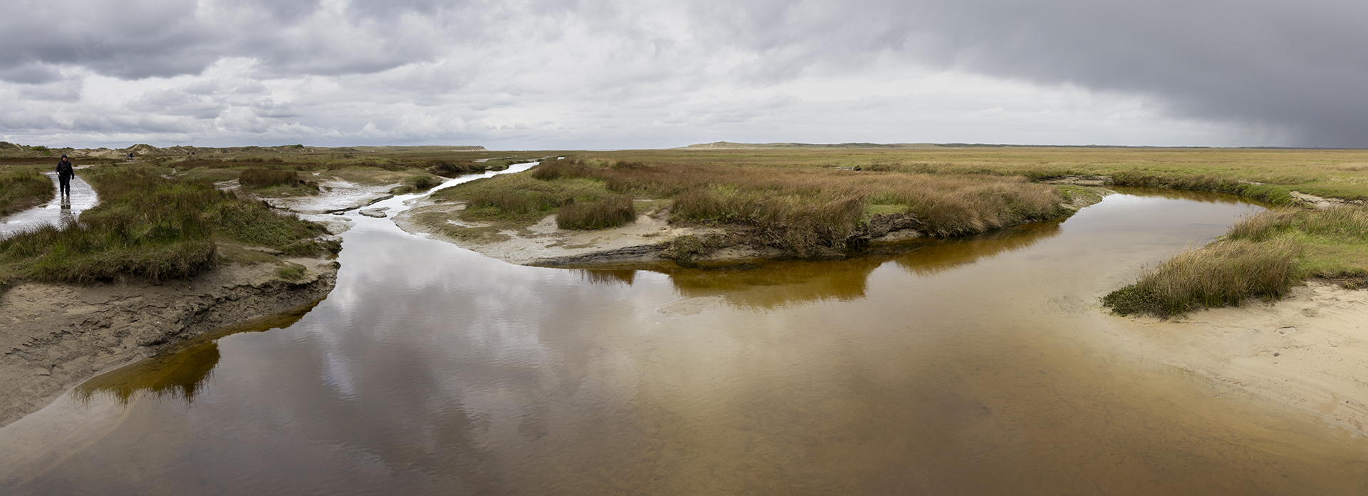 De slufter is een getijdengebied waarbij zout water vanuit zee onder invloed van het getij door geulen het land binnen kan dringen. Een bijzonder stukje landschap waarin vooral de kreekjes prachtig zijn bij hoog water. Ik wilde heel graag de weidsheid van gebied laten zien en een panorama beeld vond ik daar het meest geschikt voor. De foto is samengesteld uit 9 horizontale RAW opnames nabewerkt in Photoshop, wat de rekenkracht van de PC aardig op de proef stelde (24 mm / ISO 400 en F/16 voor voldoende scherptediepte)
