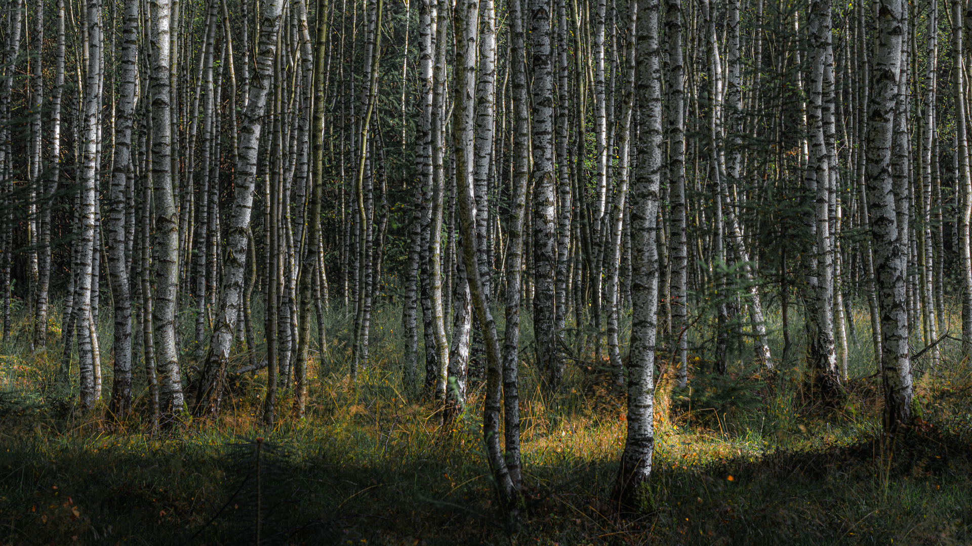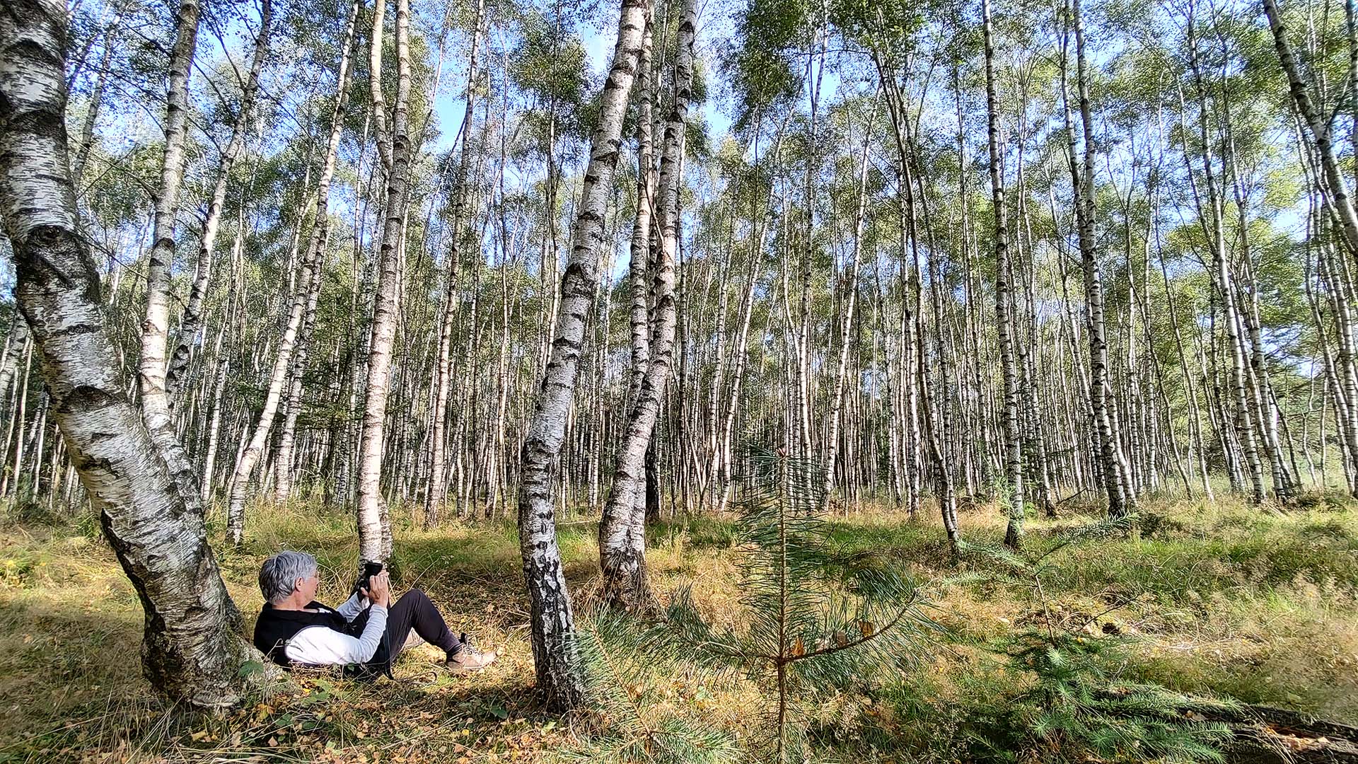 Een van mijn geliefde onderwerpen, de berk. Met name hele bossen met witte stammen. Zo lekker grafisch. Maar het licht is erg hard geworden en dan is natuurfotografie een lastige opgave. Voor mijn gevoel moet hier vandaag een foto gemaakt worden en ga ik er desondanks mee aan de slag. Even afwachten wanneer het spel van de zon en de wolken me een aardige kans biedt.