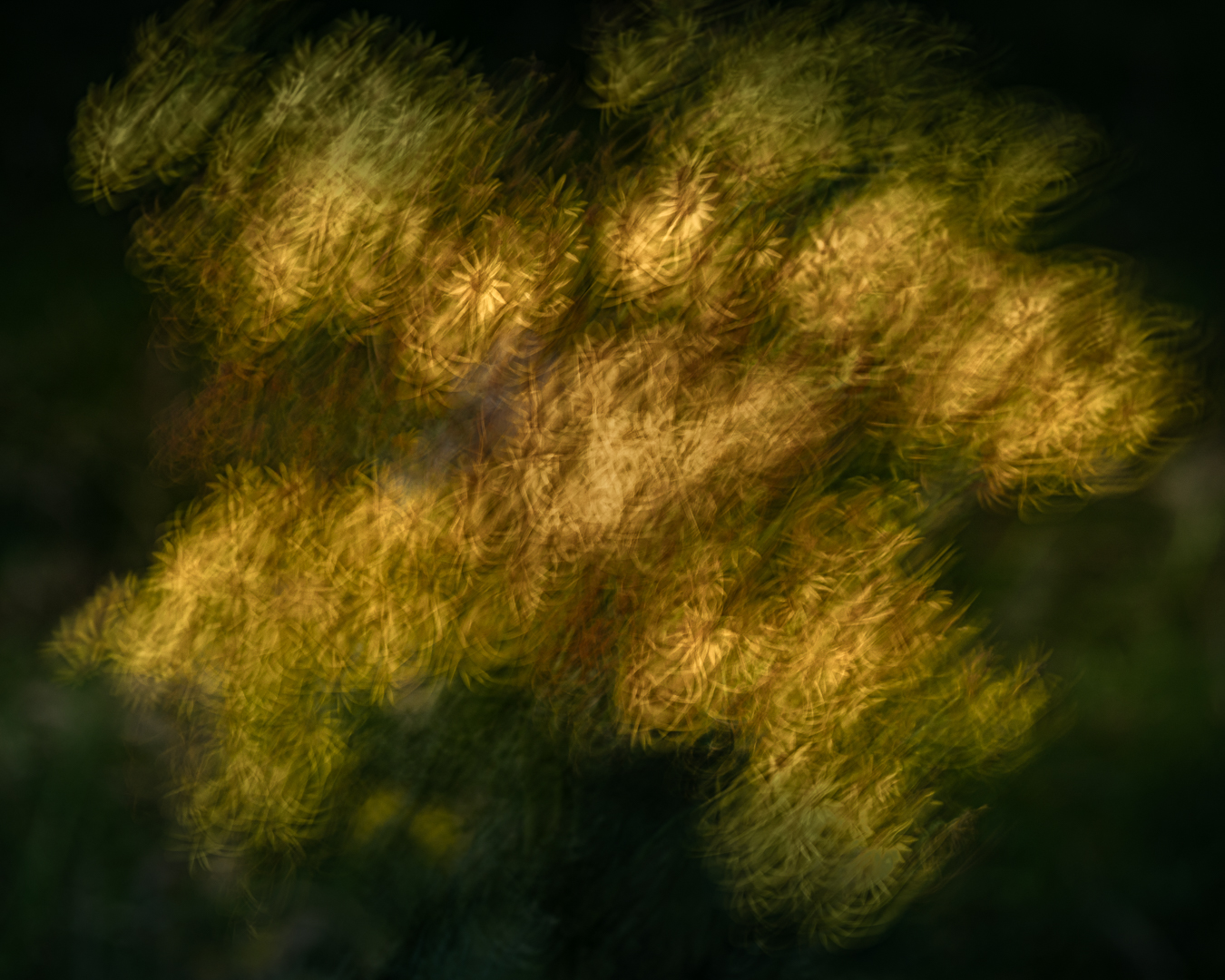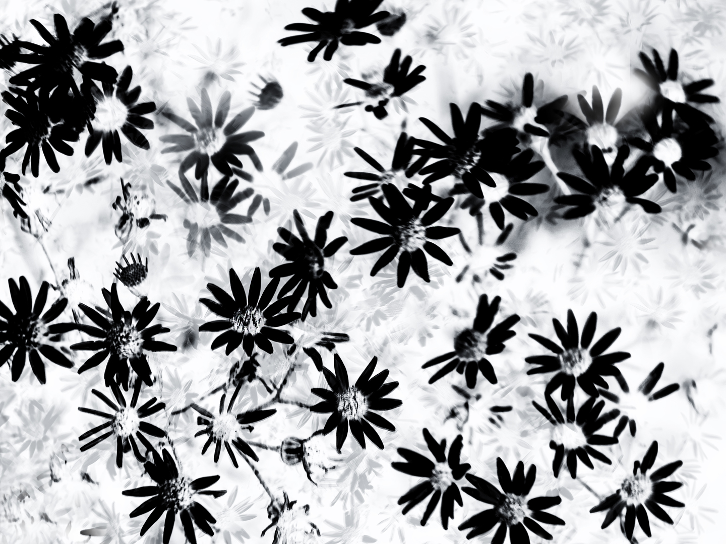 De gele bloemen van het Jacobskruiskruid hebben vele kroonblaadjes die kris kras door elkaar staan. Door er deze bewerking eraan te geven heb ik de herkenbaarheid wat weggenomen. Omgezet naar zwart/wit en in negatief bewerkt met photoshop.