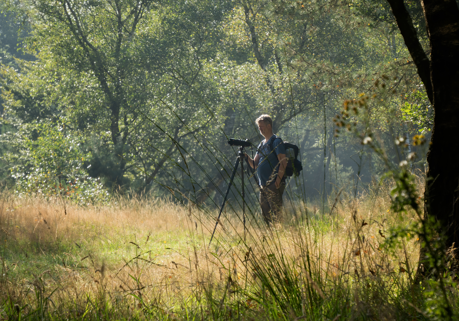 Grappig hoe we beiden totaal anders naar een onderwerp kijken. Niet alleen onze visie als fotograaf verschilt, maar door het grote verschil in lengte zien we beiden een totaal verschillende achtergrond. Mijn oog viel op jacobskruiskruid in het zonlicht tegen een donkere achtergrond. Dat lukt alleen als je ogen op bijna twee meter hoogte staan. Dat had ik me, tot dan toe, nog niet gerealiseerd.
