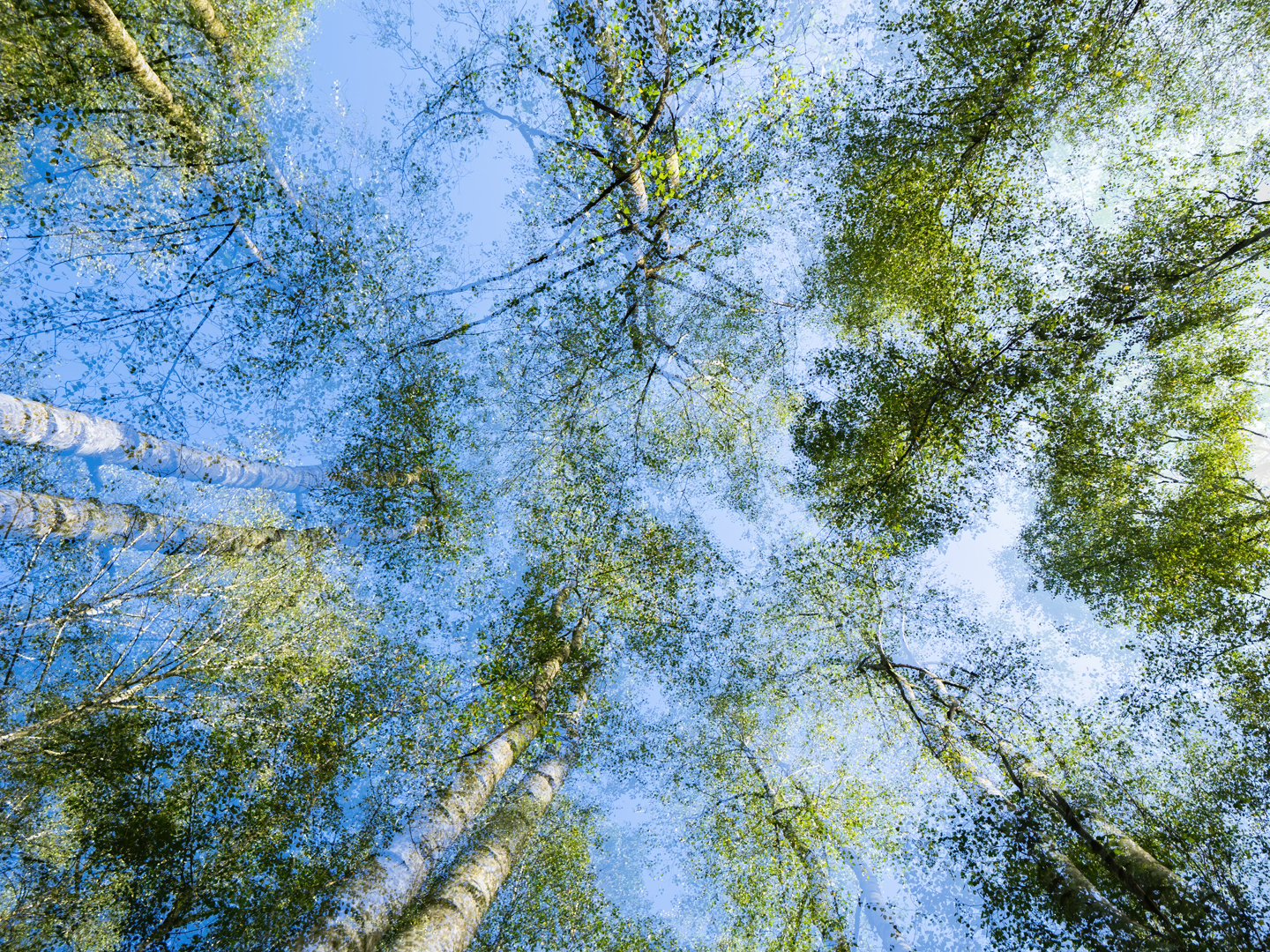 Als je voor een bosje staat met een hoeveelheid berkenstammetjes trekken die toch veelal de eerste aandacht. Ik ben hier tussen de bomen gaan staan en met een groothoeklens naar boven gericht. En er een MVB van gemaakt.