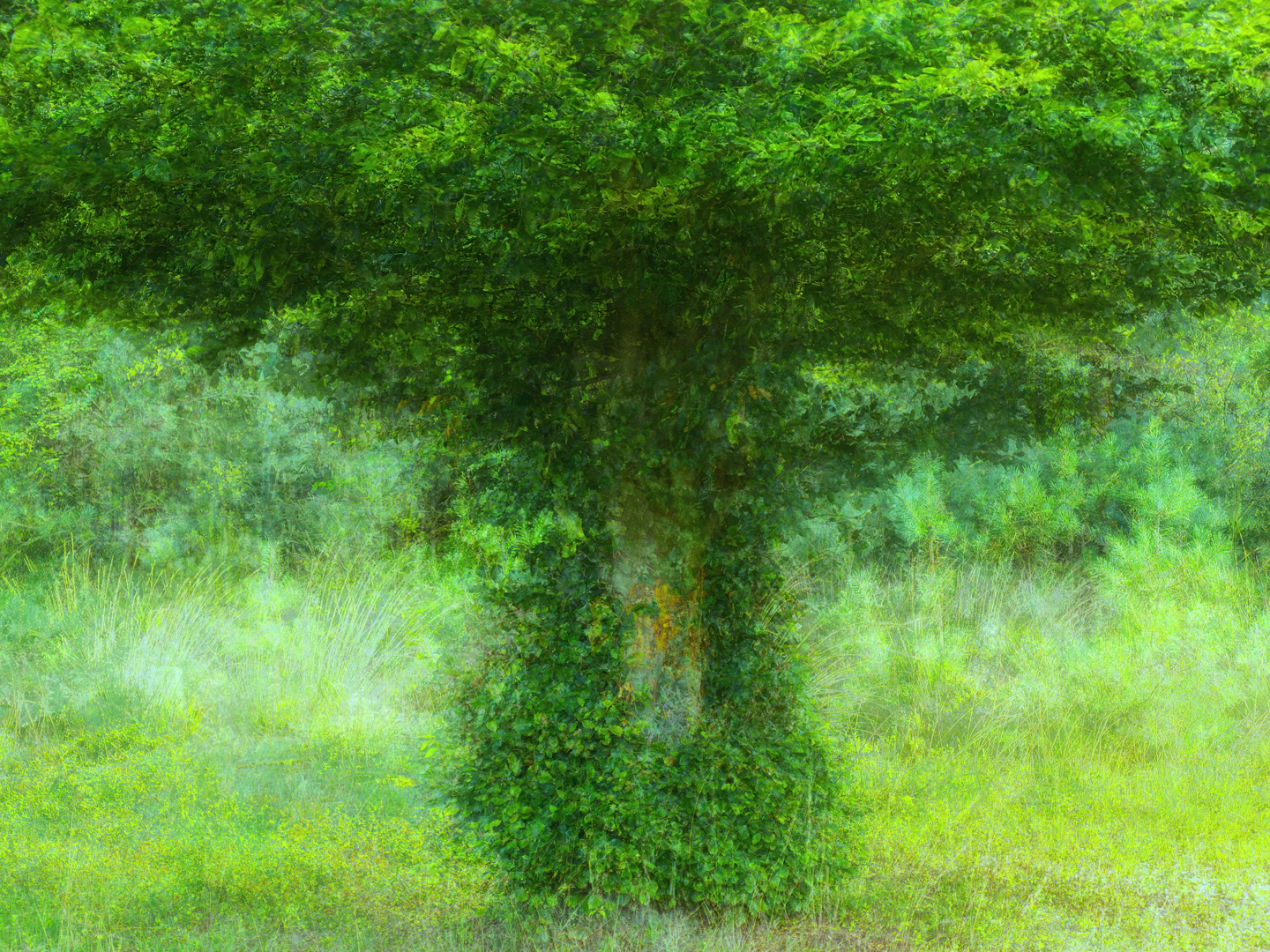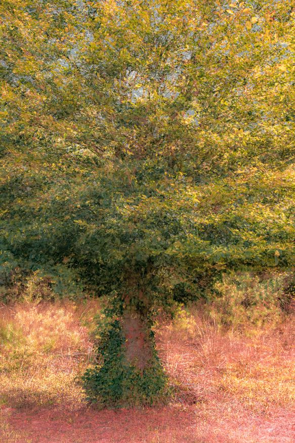 In het passeren van deze boom laat ik me ontvallen dat het een fraai onderwerp zou zijn voor de herfst omdat de stam een rokje draagt. We negeren de boom in eerste instantie maar op de terugweg kunnen we het toch niet laten om met dubbele belichting aan de slag te gaan. Alvast oefenen voor de herfst.