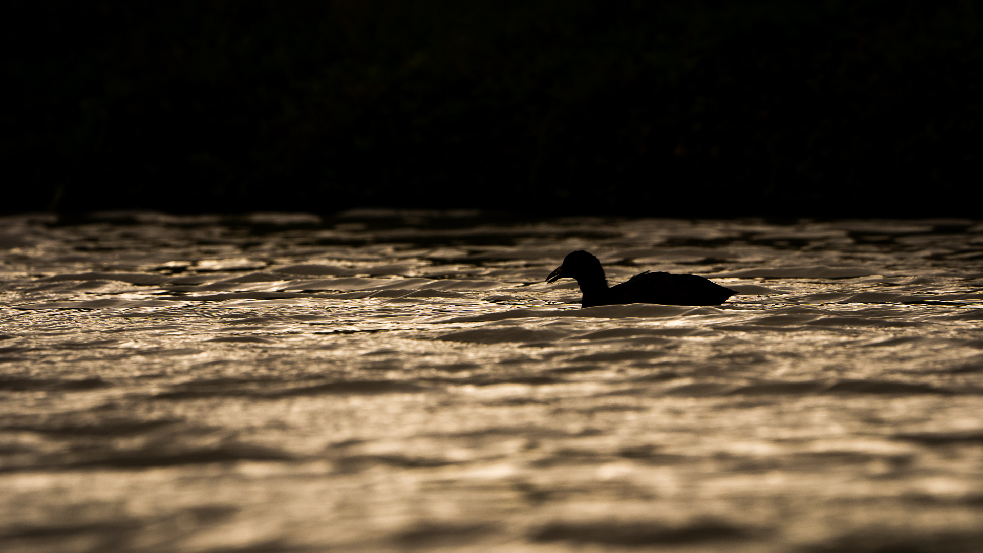 Toen kwam ineens het beloofde zonnetje heel even door, rechts fel tegenlicht vanuit hut 3 ‘Hoants’, prima om daarmee even te spelen met de daar aanwezige meerkoeten.