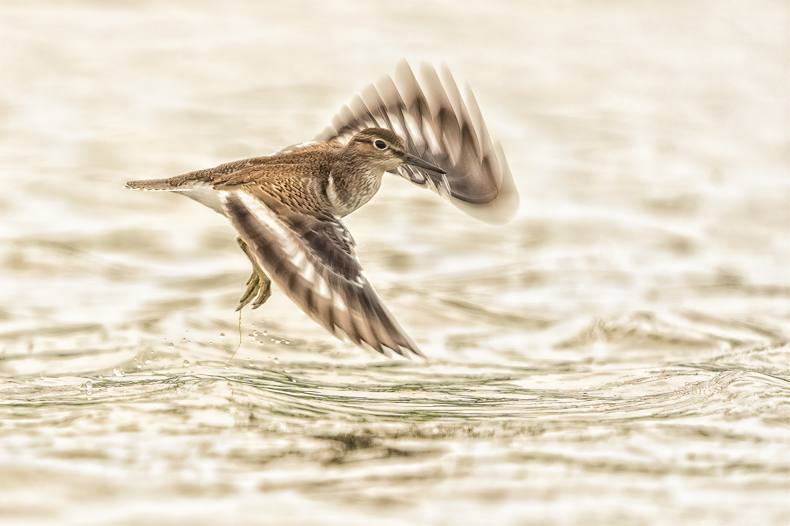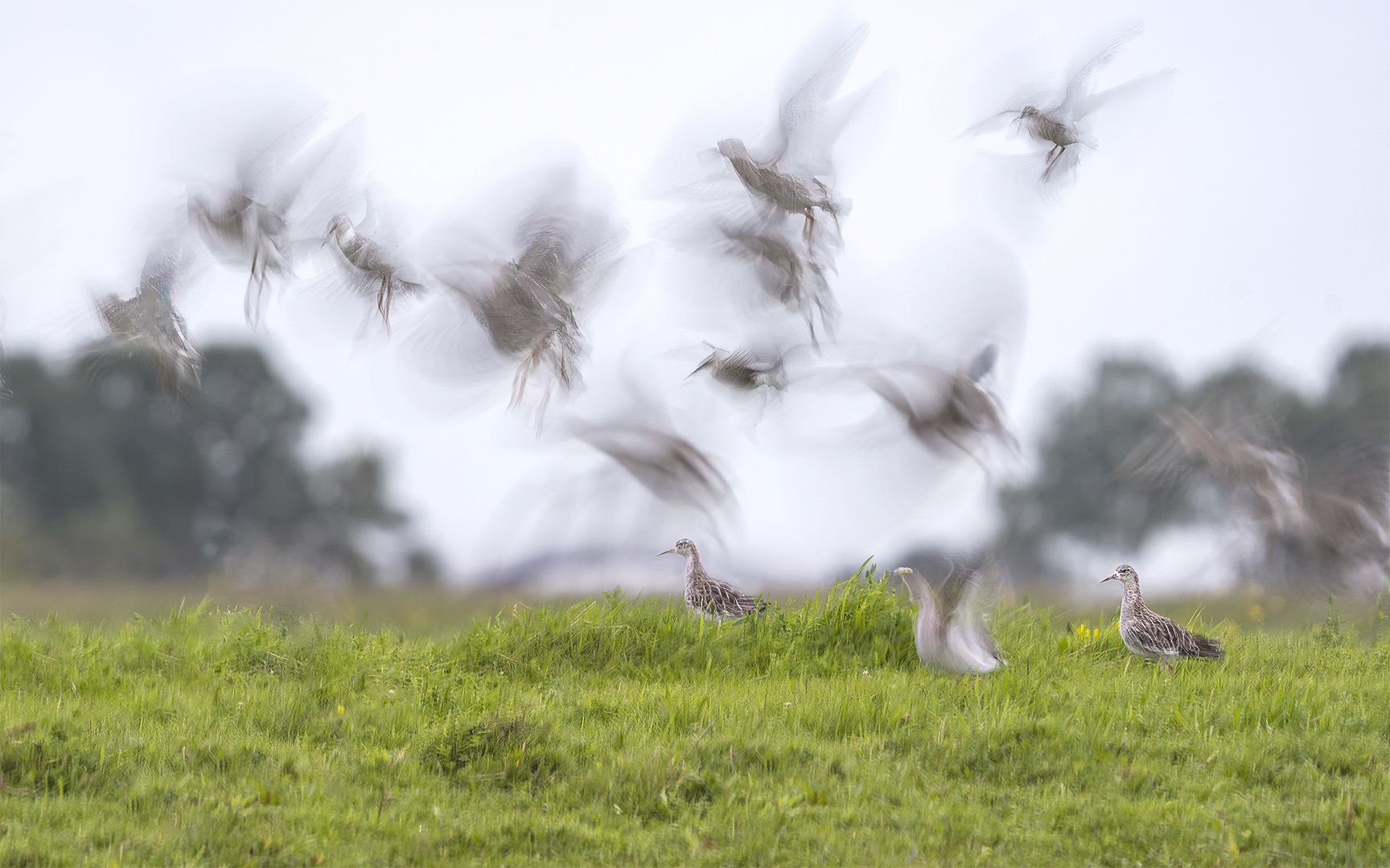 Maar genoeg vogels! Net als bij Edwin veel kemphanen voor de hut, maar ze zijn, mogelijk door mijn aankomst, onrustig en vliegerig. Omdat ik sowieso licht tekort kom stel ik de camera in op een lange sluitertijd (1/13) om de beweging in beeld te vangen als ze weer opvliegen. Het resultaat is niet 100% naar mijn zin, maar toch een leuk dynamisch begin van de dag.