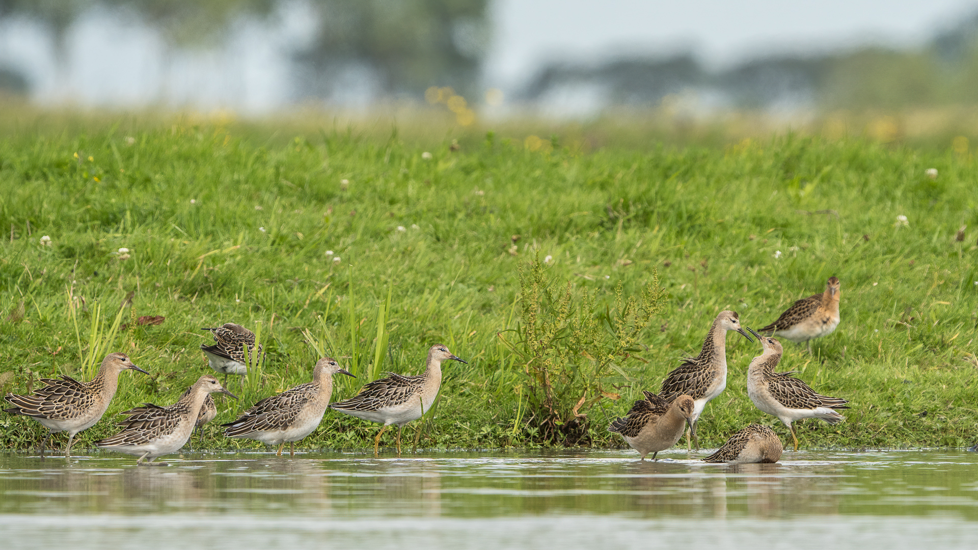 Rond half 2 zat er ineens een grote groep kemphanen aan de overkant, uitgebreid poetsend en badderend. Ik schoot megaveel foto’s maar alles was één grote chaos, pas toen een groot deel weer was vertrokken lukte het om rust in de chaos te scheppen.