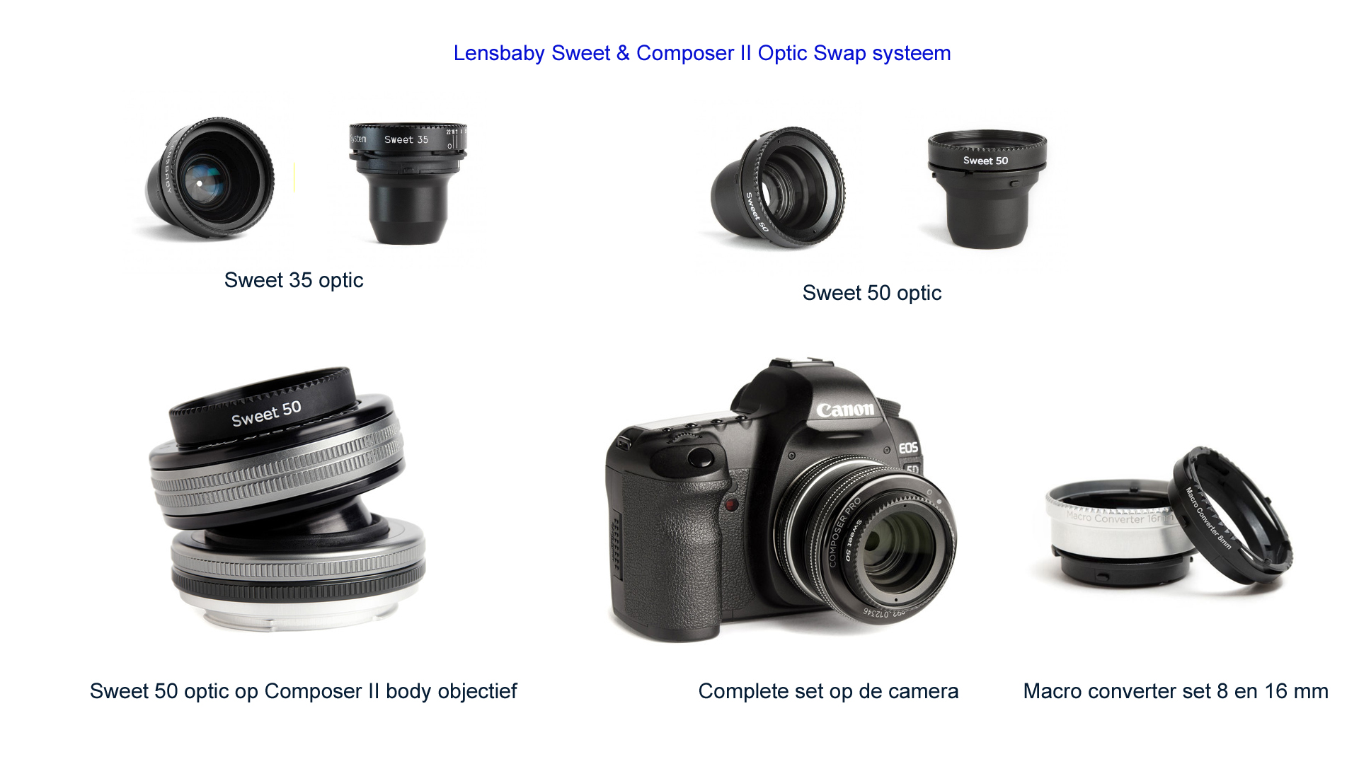 De firma Lensbaby maakt vele soorten creatieve objectieven waarvan er een aantal vast zijn (die direct op de camera geplaatst worden) en een aantal losse objectieven die je bijvoorbeeld op de composer II kan plaatsen. De Sweet objectieven die ik hier bespreek zijn deel van het “Optic Swap systeem”. Ik maak gebruik van het body objectief Composer Pro II. Op deze body kan je meerdere losse objectieven plaatsen zoals de Sweet (zie: afbeeldingen hieronder), Edge, Creative bokeh enTwist 60 optics. Elk objectief heeft weer zijn eigen creatieve effect.