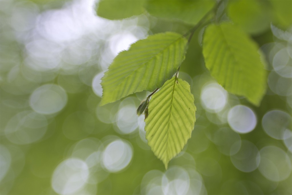 Hier is duidelijk te zien dat er een grotere hoek is in vergelijk met de 50 mm lens (meer groothoek effect). De sweetspot (scherpstelpunt) is hier gelegd op de onderste bloem waardoor er een onscherpte optreedt in de andere bloemen. De lens geeft een mooi schilderachtig effect en heeft een typerend bokeh wat enigszins eivormig is. Geen gemakkelijke objectieven, maar oh zo fijn en creatief om mee te werken als je ze eenmaal “door” hebt, een aanrader dus. De uitgelichte opname is gemaakt met de Sweet 50 zonder converter, waarbij scherp gesteld is op het jonge beukenblad. Het bokeh is duidelijk ronder dan dat van de 35 mm optic.