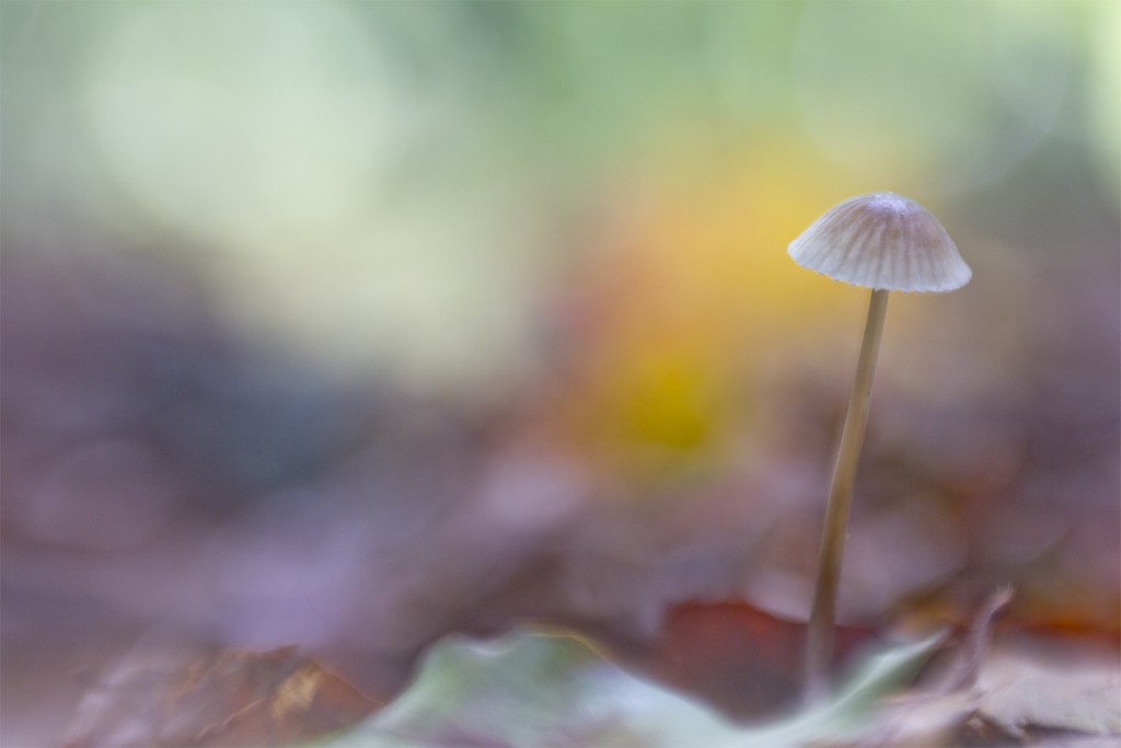 Hierbij is de sweet spot (scherpstelpunt) verplaatst naar rechts boven op het hoedje van de paddenstoel). Hierdoor worden de kleuren van de omgeving uitgesmeerd in een pastelachtige vervaging.