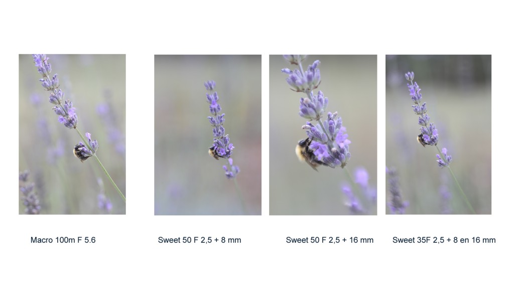 De Sweet 50 bevat 2 elementen in 1 groep en de Sweet 35 bevat 4 elementen in 3 groepen.Behalve dat de Sweet 35 dus een grotere hoek heeft is het bokeh ook totaal anders. In onderstaande vergelijking zie je verschillen tussen een 100 mm macro objectief en de twee lensbaby’s. Hierbij is de Sweet spot bij alle 3 ongeveer in het midden op het insect geplaatst, dus er is nauwelijks verdraaid aan de composer. Tevens stond het diafragma volledig open om een zo klein mogelijk scherpstelpunt te hebben, waardoor er een fraai zacht beeld ontstaat met duidelijk meer vervaging als bij gebruik van de standaard macro lens. Je ziet ook duidelijk het effect van de hoek waarbinnen het objectief werkt; bij de 35 mm zie je meer een groothoek effect in je opname.